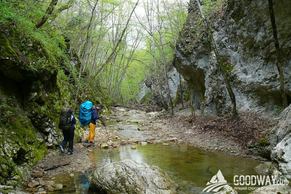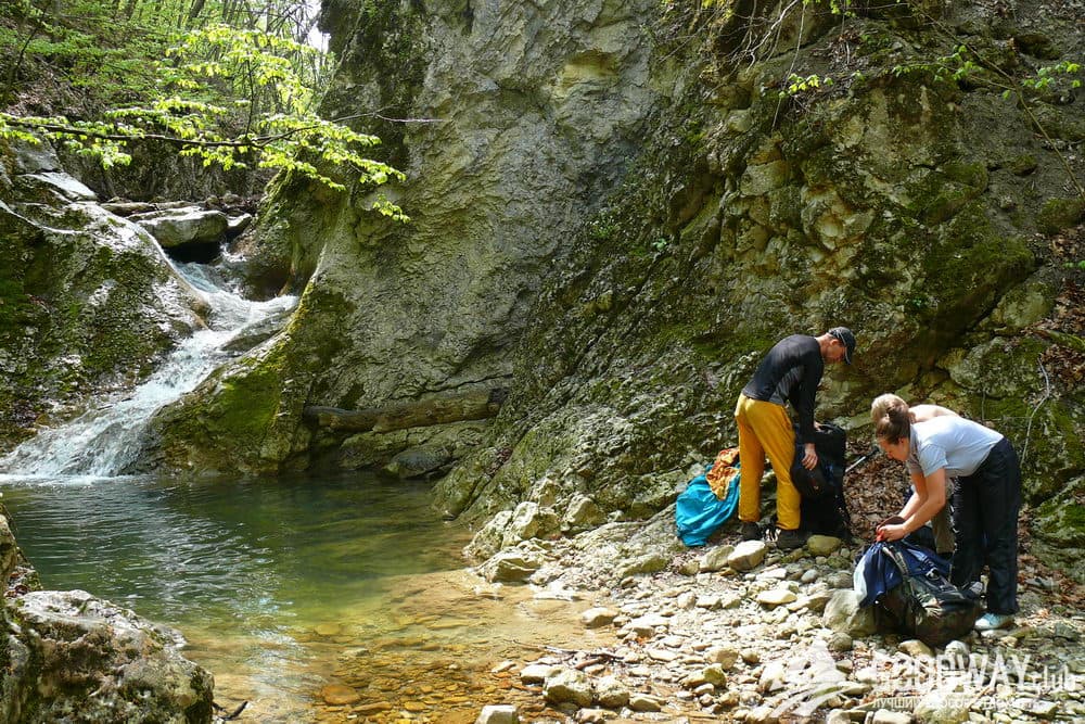 Немного поднимемся по буковому лесу и выйдем на стоянку-перевал Верхний Кок-Асан. Отсюда спустимся в живописнейший каньон Кучук-Карасу. Его ещё называют малым каньоном Крыма. Перекаты, ванночки, озёрца, водопады будут постоянно радовать глаз по пути через каньон. По аналогии с Большим каньоном тут есть аж три ванны молодости, такие же холодные и прозрачные. Заночуем прямо в каньоне, возле водопада и небольшого озера.
