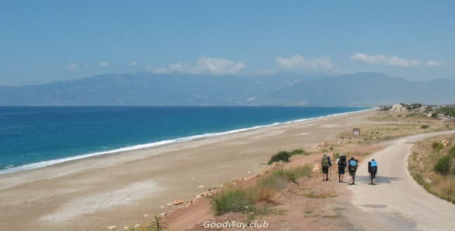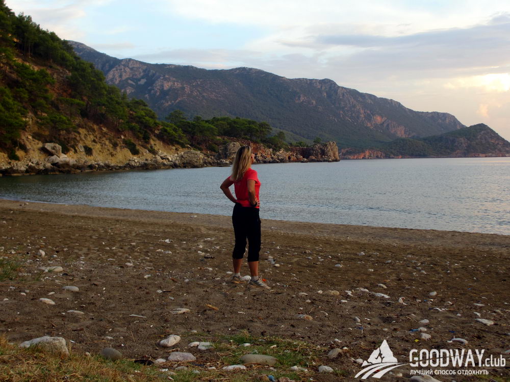 Небольшой подъём, и мы на перевале. Какой отсюда вид! С одной стороны — горный массив Бейдаглары во главе с Тахталы, с другой стороны — море. Отсюда уже виден пляж Чиралы, наша сегодняшняя цель. Здесь же мы неожиданно обнаружим первые огни Химеры. Так необычно – прямо из земли-пламя, как вечный огонь! С десяток огней. Существует длинная легенда из греческой мифологии, согласно которой Беллерофон на крылатом коне Пегасе втоптал здесь в землю огнедышащего дракона Химеру, но его огонь до сих пор вырывается из недр горы Янарташ. На самом деле это природный газ выходит здесь из-под земли и однажды загоревшись, не тухнет уже несколько тысяч лет. Пониже есть действительно большие огни, высотой до метра. Ещё немного — и мы на шикарнейшем пляже. Мелкая галька и крупный песок. Мусора нет вообще, даже окурков! 4км длиной и 150-200м шириной! Пляж Чиралы входит в десятку лучших пляжей мира! На пляж для кладки яиц здесь выходят большие морские черепахи. Прозрачная и тёплая вода, много разной рыбы — рай, в котором захочется остаться навсегда. Здесь мы действительно расслабимся. Поселимся в кемпинге в 100 метрах от моря, где в нашем распоряжении будут горячий душ, стиральная машинка, кухня с газовой плитой и Wi-Fi. В кемпинг мы дойдём ещё до обеда, так что будет много времени чтобы покупаться, позагорать, привести себя в порядок. Накупим вкусняшек и фруктов, вечером будет вкусный ужин!