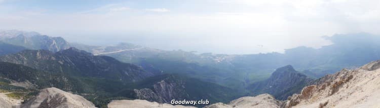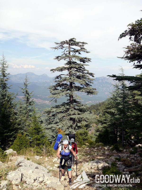 Как правило, ближе к обеду вершину Тахталы обычно затягивают облака, поэтому мы сегодня соберём лагерь раньше обычного, и продолжим подъём до перевала 1800м. Здесь оставим рюкзаки и налегке «сбегаем» в радиалку на гору. На склонах Тахталы растительности нет — только каменная пустыня. На вершине нас ожидает несколько неприятное открытие: сюда с берега моря в 2006г. построили канатную дорогу, и теперь на вершине кафешки, магазины, толпа народу… Мы спускаемся назад к рюкзакам, и продолжаем спуск дальше, снова через сказочный кедровый лес. Здесь попадаются очень древние кедры, возрастом свыше 1000 лет! Заночуем на приятной полянке с видом на деревню Бейджик и море.
