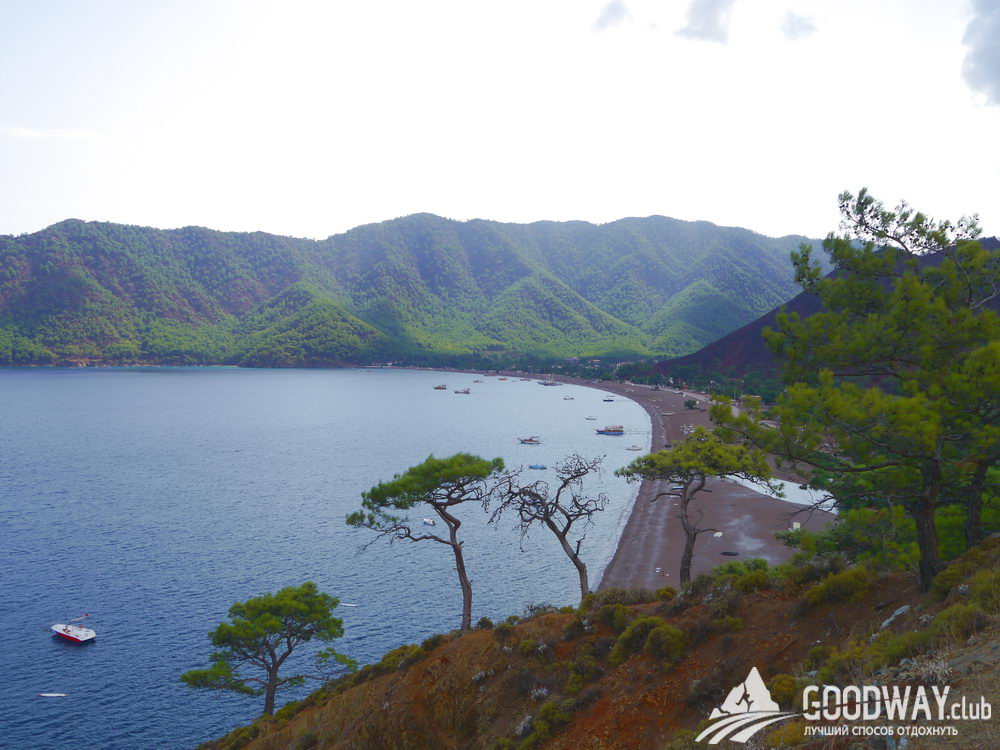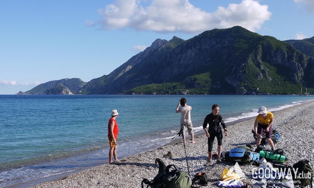 Чтобы избежать нудного и неинтересного перехода через перевалал Муса, сядем на катер и переедем в бухту Сазак. Сказочно красивая бухточка! Потом немного пройдёмся и окажемся в другой дикой уединённой бухте с видом на посёлок Адрасан. Здесь на берегу и заночуем.