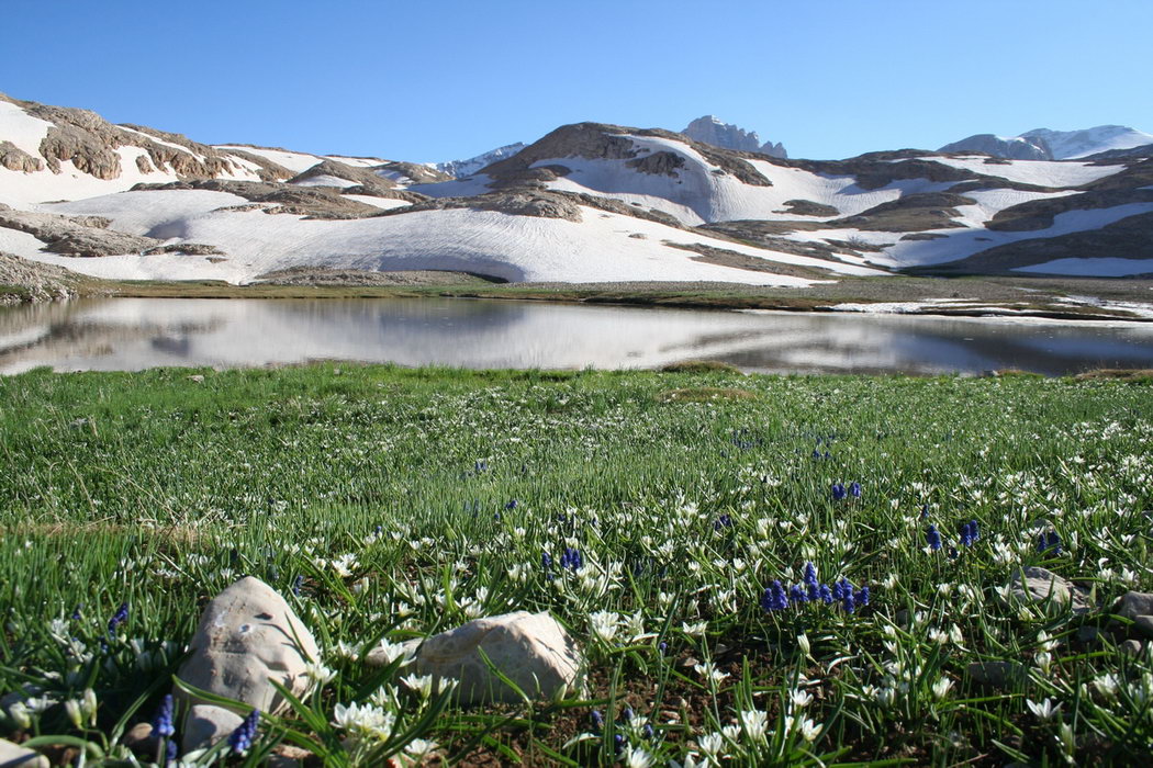 Продолжим набирать высоту. Лето сменится ранней весной, и повсюду раскинутся буйно цветущие альпийские луга. Среди всего этого великолепия мы поднимаемся на перевал Текекалеси 3450м и спускаемся на плато Едигёль (7 озёр). Множество озёр, море цветов, кое-где и снег лежит. И всё это на фоне грозных пиков Аладаглара! Зрелище впечатляющее, здесь мы и заночуем.