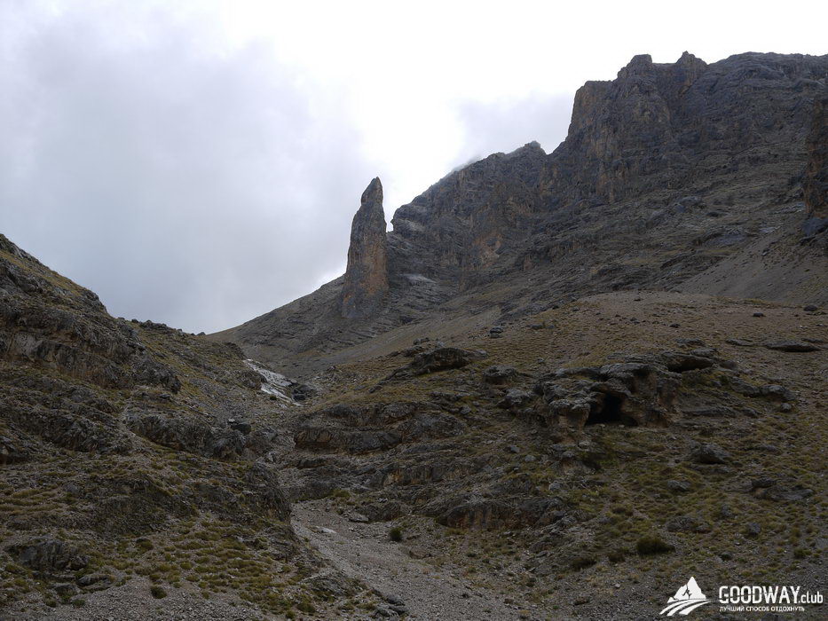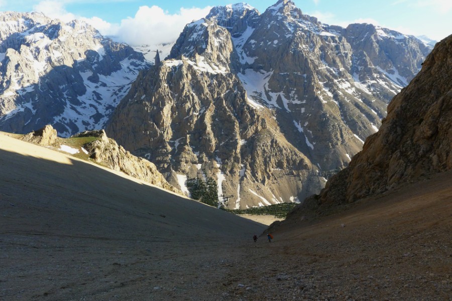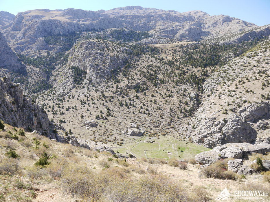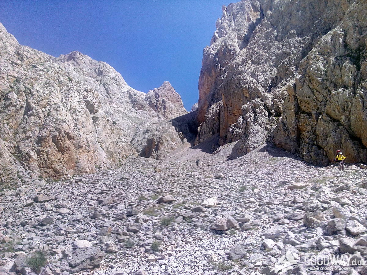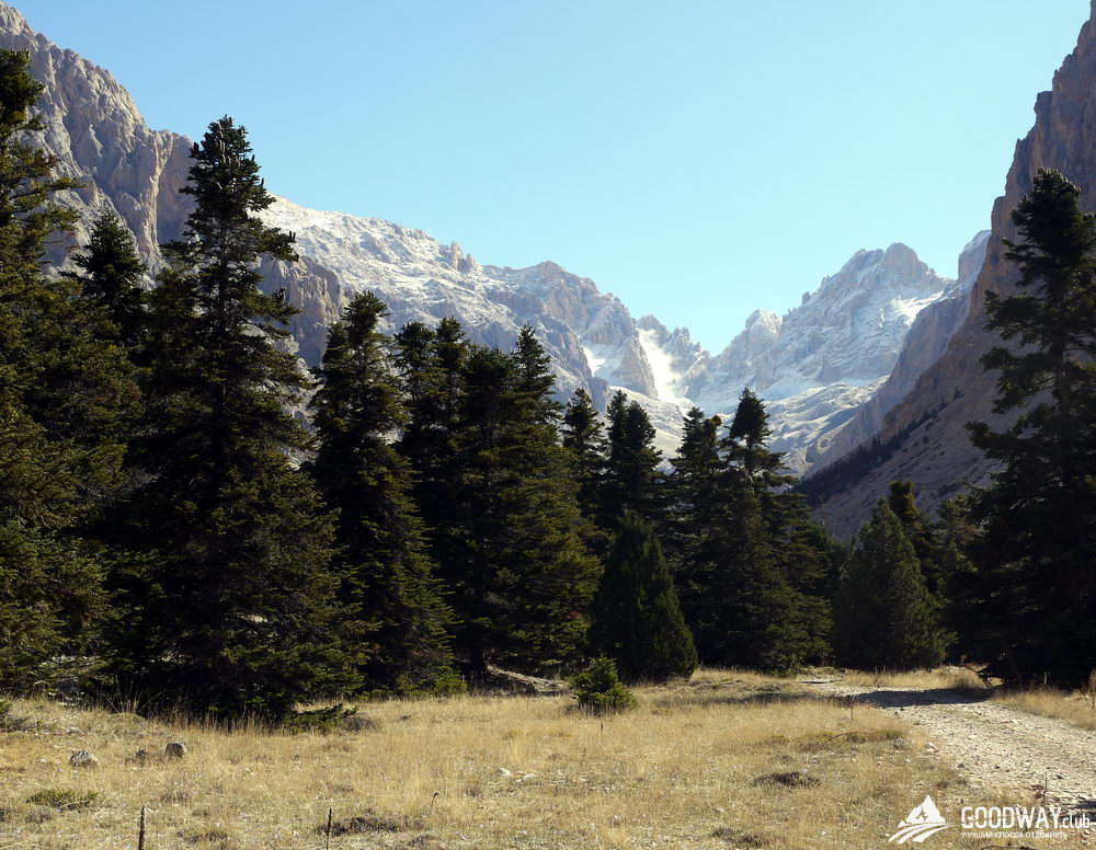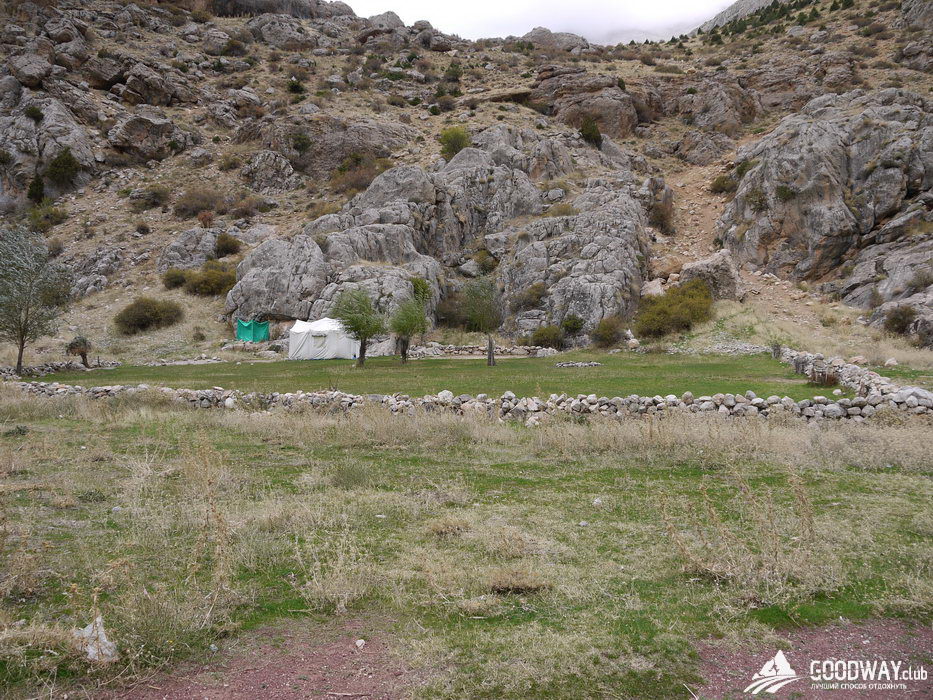 Над нами нависает громадина Демирказык — самый высокий в Аладагларах — 3756м. Пройдём всё плато Эзневит и спустимся в долину Эмли, здесь уже зелень и уют. Со всех сторон она окружена скалами, место поразительно-сказочное! Радиально сходим в следующую долину — Сыйирма и к скале Пармак-кая. На ночёвку спустимся до 1800м, на чудесную зелёную поляну.