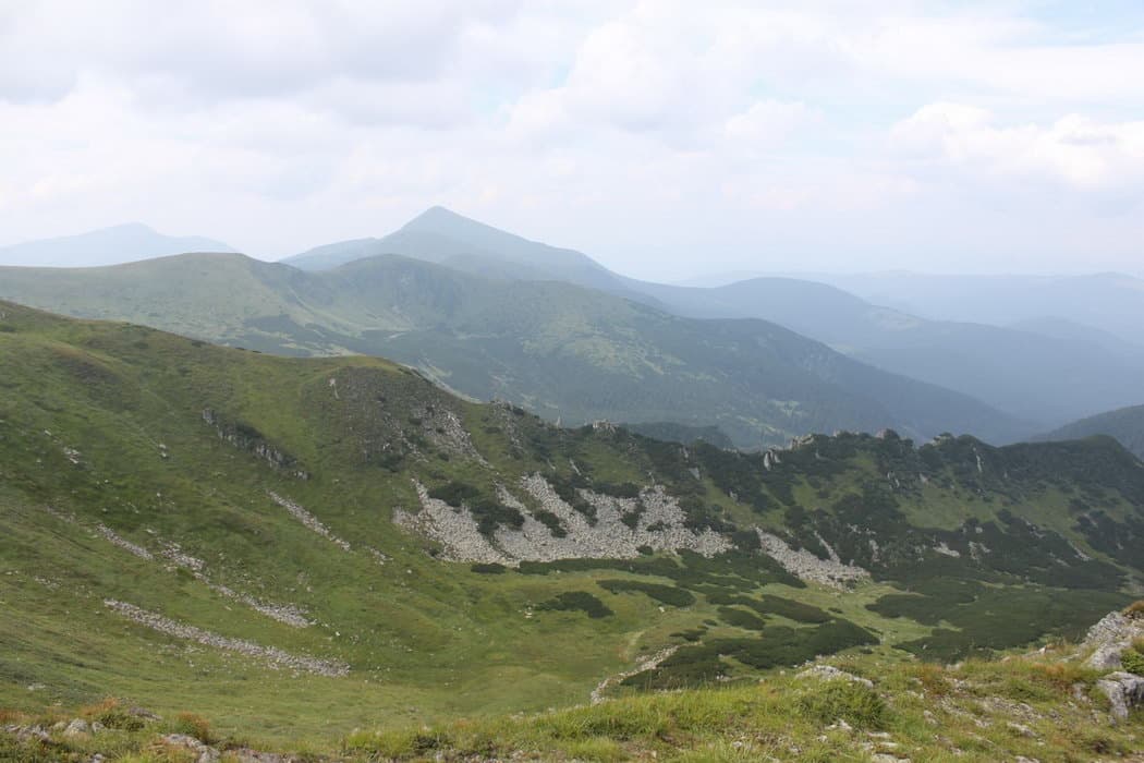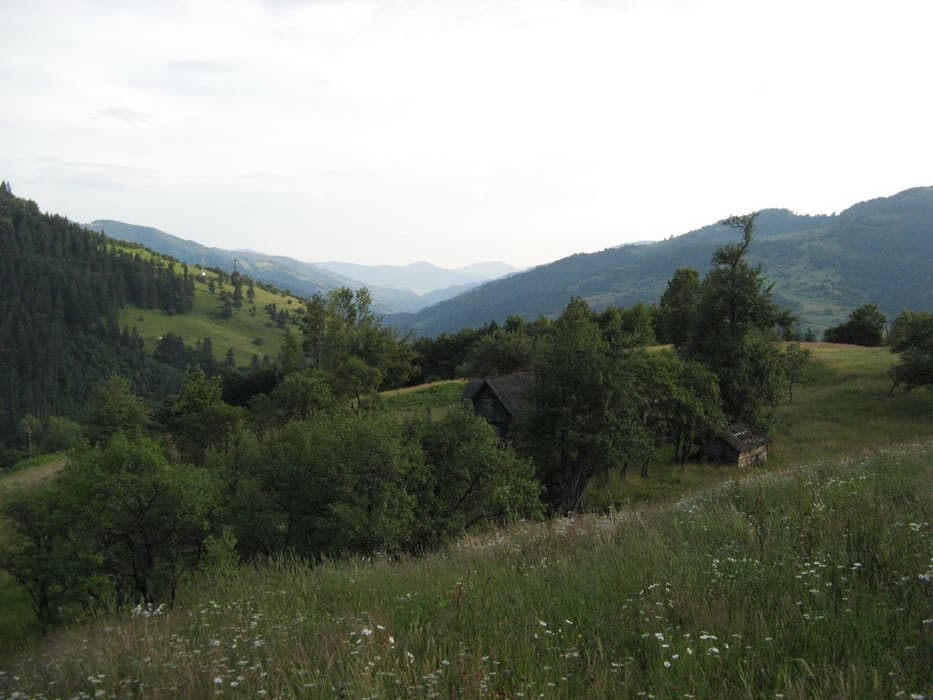 Постепенно поднимаясь, выберемся на открытый гребень. Это и есть начало Черногорского хребта. Ещё чуток попыхтим, и окажемся на г. Петрос. На вершине небольшая деревянная каплычка (часовенка) и железный крест. Видно весь Черногорский хребет, а Говерла будто и совсем в двух шагах 🙂 Но туда мы доберёмся лишь завтра, а сегодня нам хватило бы духу и сил спуститься на седловину. Спуск этот будет пожалуй, самым трудным за весь поход. В случае дождя спрячемся на ночь в пастушеском домике – коше.