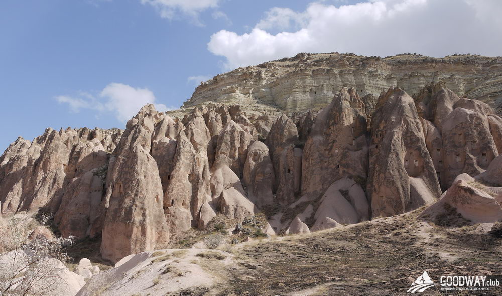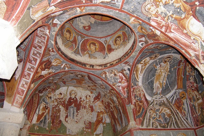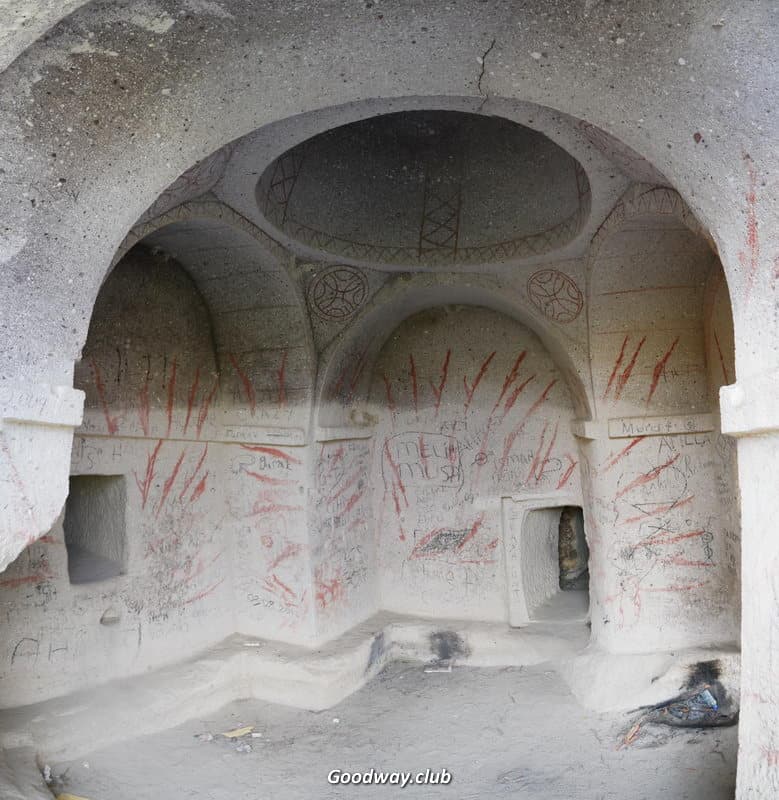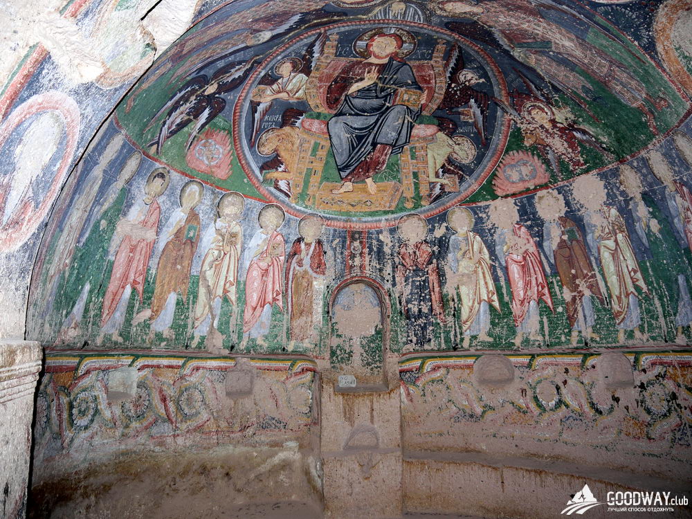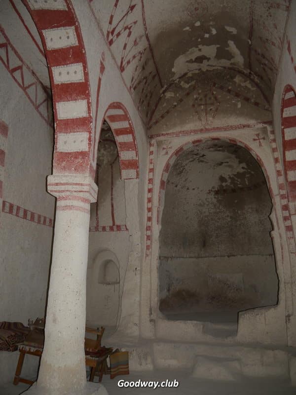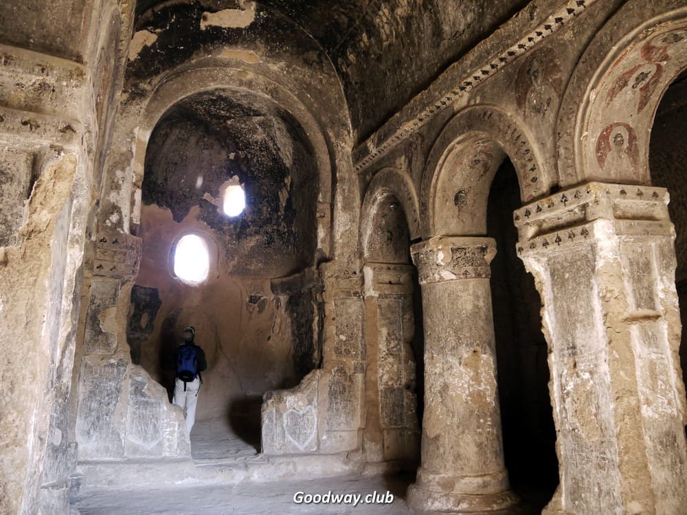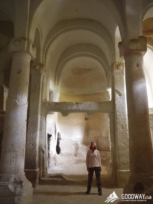 Следующим пунктом Розовая Долина. Скалы здесь действительно розового цвета, а иногда и жёлтого. И повсюду – окна, двери, комнаты, кельи, храмы. Посетим несколько пещерных храмов. Церковь Hacli – с сохранившимися фресками, а церковь Kolomlu – одна из наибольших пещерных церквей, с колоннами и высотой свода более 10м! И всё вырезано внутри цельных скал, невероятно!