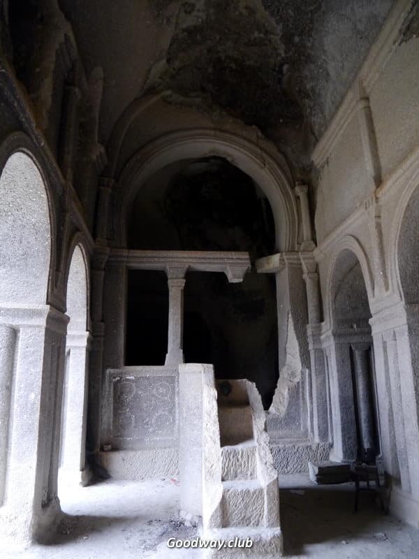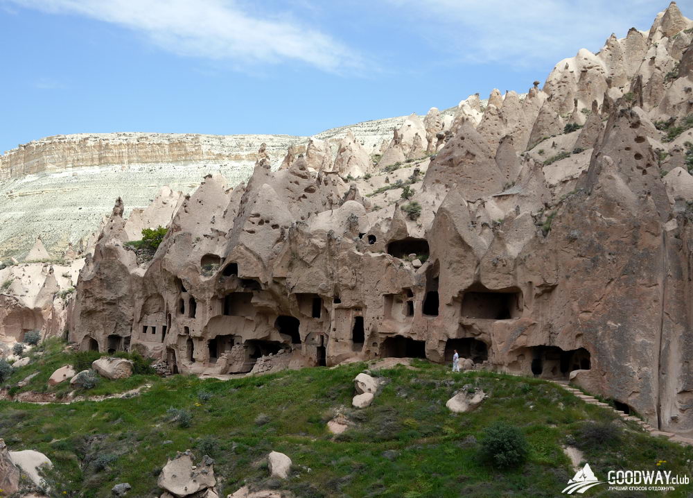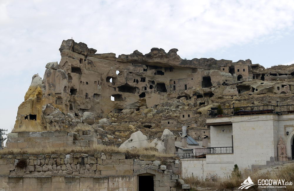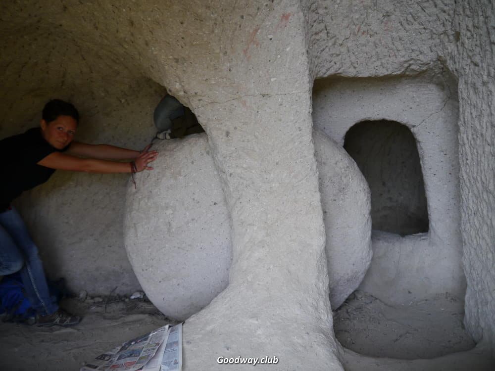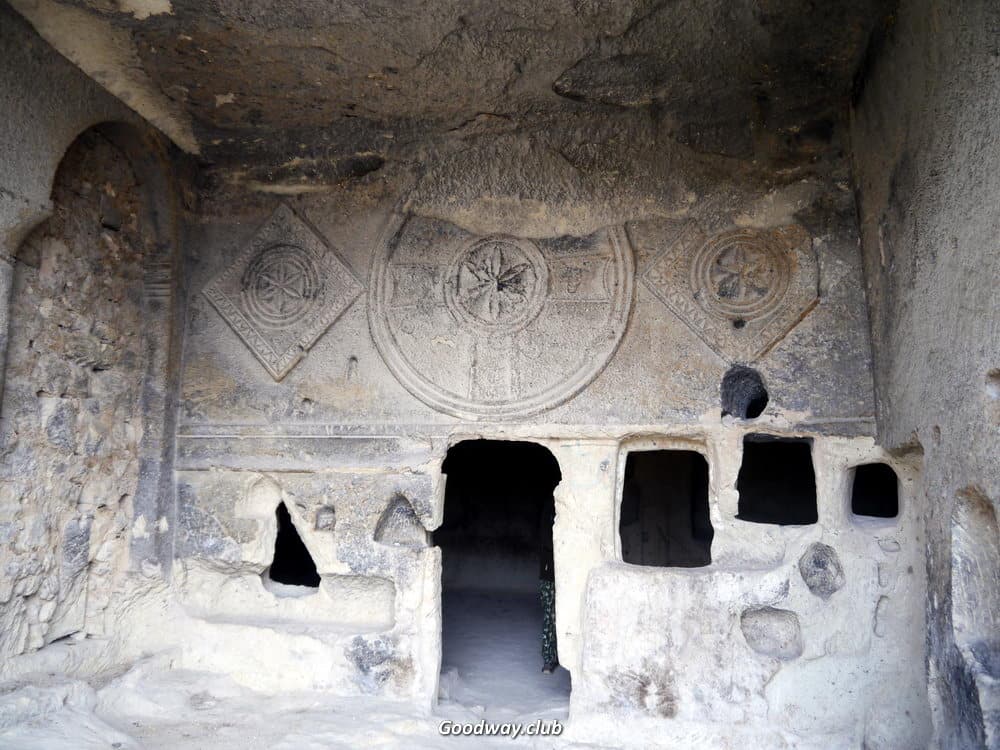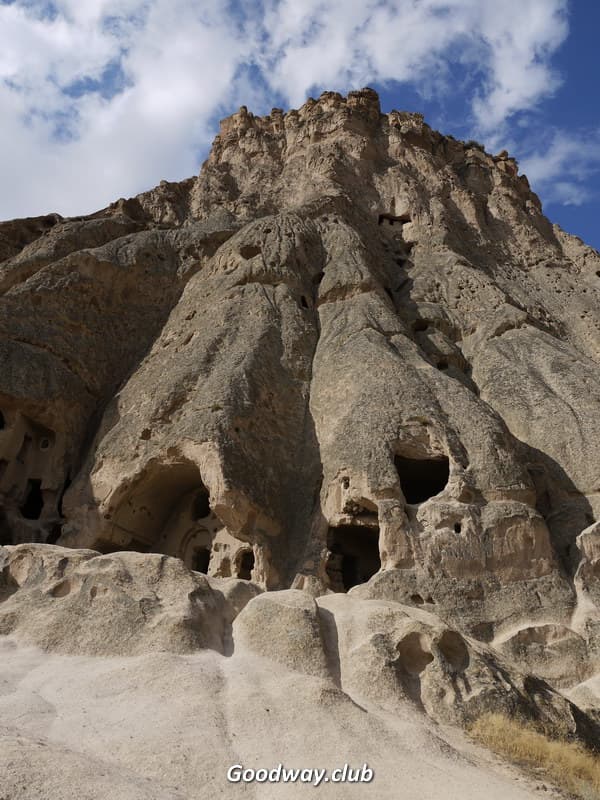 Мимо Розовой долины пройдёмся к руинам пещерного монастыря в Чавушине. Неутомимые древние христиане постепенно превратили гору в целый многоэтажный дом. Из-за землетрясения передняя стена «дома» обвалилась, и теперь всё видно как в разрезе. Мы постепенно заберёмся на самый верх, полазим по комнатам разных этажей, заглянем в монастырский храм.