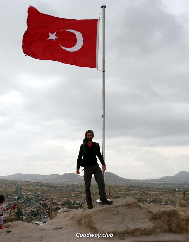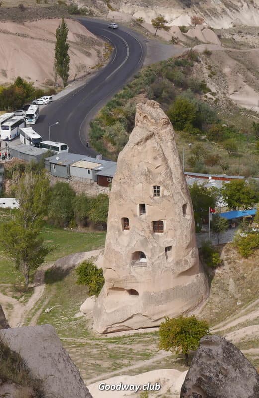 Сегодняшний день будет богат на лазание по узким ходам каппадокийских пещер. На автобусе проедем в Ортахисар. Наподобие Учисара, посреди города стоит высокая скала и через ходы и помещения внутри неё можно пробраться на самый верх. Затем перейдём к церкви Айнали. Здесь тоже много ходов. Но интереснее: местами полная темнота. Так что надеваем фонарики и исследуем потаённые лабиринты. Потом выберемся на воздух и пройдёмся по Опенэйр музею Гёреме. Здесь очень много пещерных построек, несколько храмов с фресками и росписями. Затем полазим по интересной церкви в долине Земи. Не такая тёмная, как Айнали, но тоже впечатляющая. Дальше будет урочище Горкундере, где побродим среди огромных каменных фаллосов. В Гёреме спустимся через смотровую площадку, на которой встречали закат в первый день.
