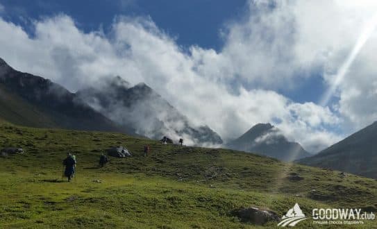 В этот день нас ждёт масса сказочных видов. Проходим кусок цивилизации — шумный палаточный лагерь. Зародился он как базовый лагерь альпинистов, стартующих на вершину г. Каракол. А теперь стал пристанищем простых любителей природы, с магазинами, ресторанами и баней.