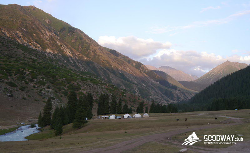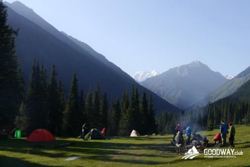 С утра отправляемся на прогулку без рюкзаков к водопаду. По пути пройдём большой юрточный лагерь, посмотрим, как живут местные пастухи. После обеда собираем лагерь и продолжаем путешествие плавным подъёмом в горы Тянь-Шаня к перевалу Телеты. Тропа идёт вдоль речки, постоянно приходится переходить притоки. Лес постепенно редеет, потом и вовсе заканчивается, мы выходим в обширную долину и не можем более двигаться, приклеенные к изумительному многоплановому виду.