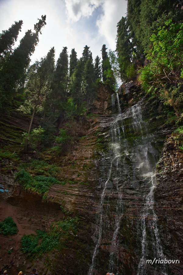 Справа горы такой высоты, что ледники наверху будто парят в воздухе, не отличить то ли это облака, то ли снежные вершины. Слева выжженные солнцем скалы, жарко и душно и сухо. Тем ярче оказывается контраст, когда мы прибываем в заповедник Джеты-Огуз, отсюда начинается наше пешеходное путешествие.
