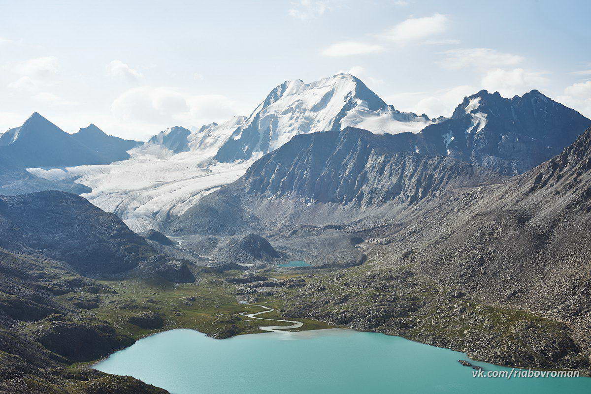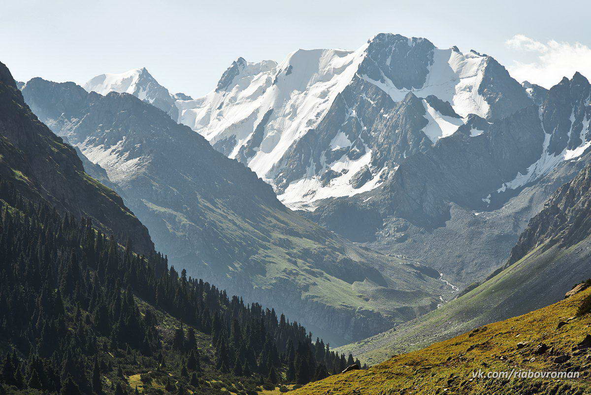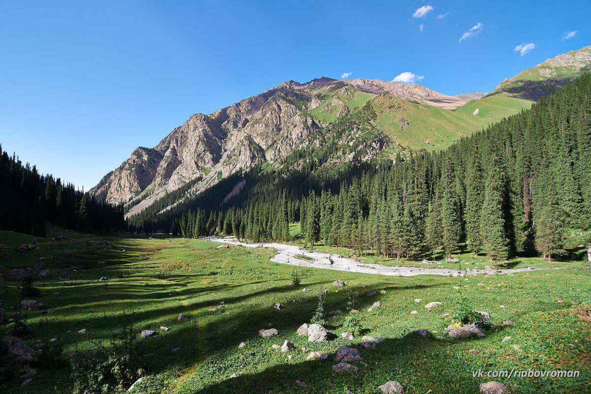 Постепенно лес заканчивается, мы входим в широкую долину и тут захватывает дух от открывшегося вида! На заднем плане снежный пик Каракола (5218м), перед ним горы пониже и речка, петляющая по долине! Надолго зависли тут наши фотографы…