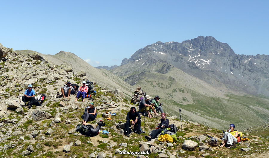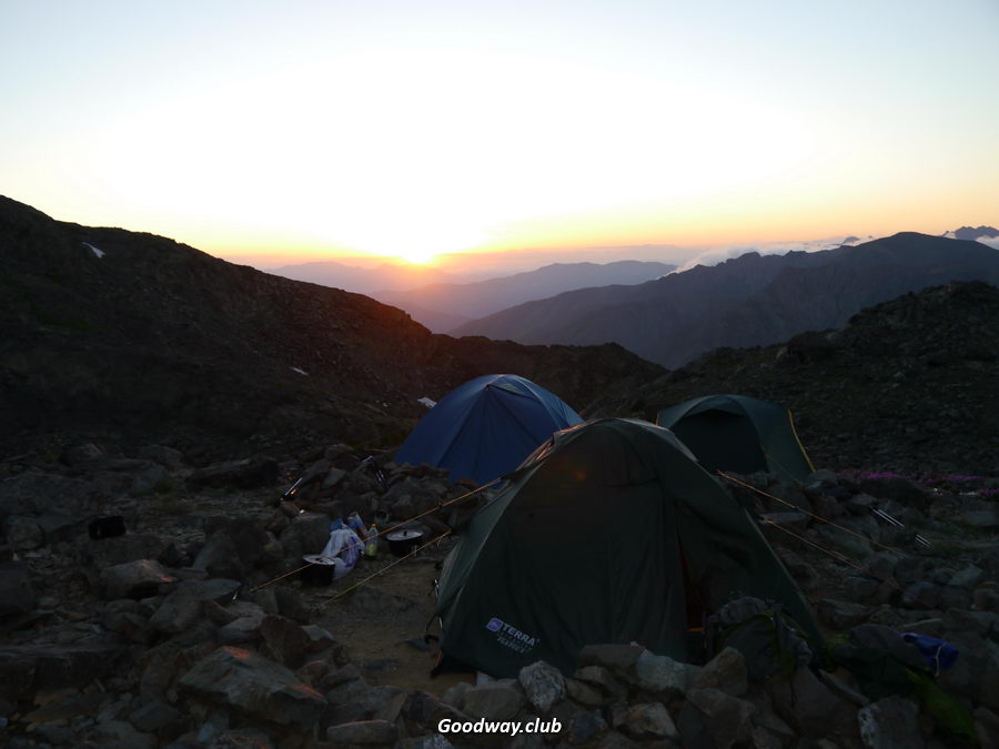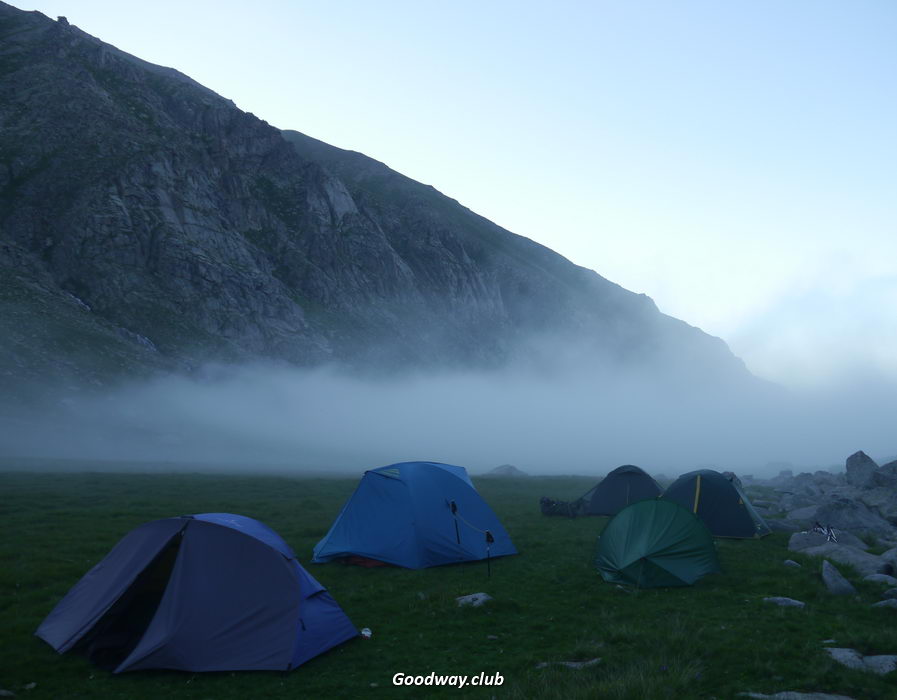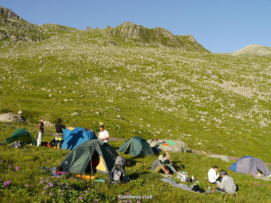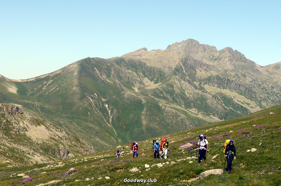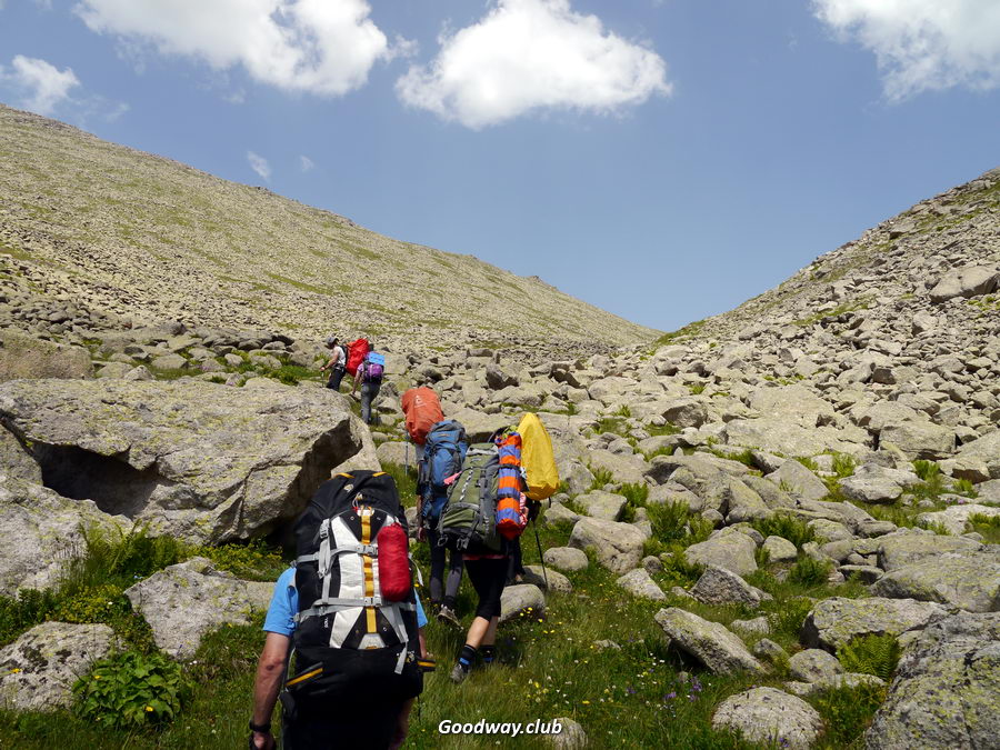 Каждый день мы забираемся всё выше. Сегодняшняя цель — озеро Дениз, самое большое и высокое озеро Качкара. В переводе с турецкого Дениз это Море. Расположено оно на высоте 3370м. Путь к нему лежит по цветастым альпийским лугам, мимо небольшого озера Атсиз, через перевал Дениз 3430м. Лагерь поставим на берегу озера. Оно довольно холодное, но быстренько окунуться не помешает. На стоянку скорее всего придём ещё до обеда, так что сегодня полуднёвка, отдых и акклиматизация перед завтрашним восхождением.