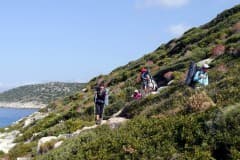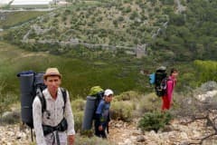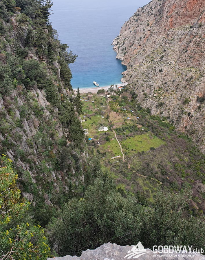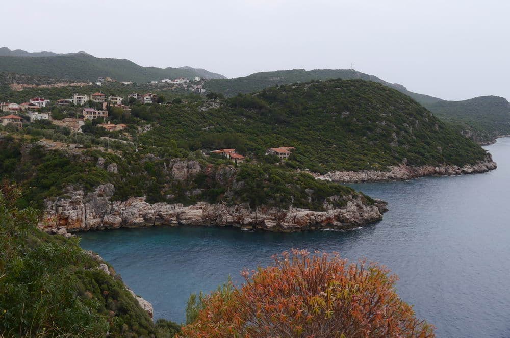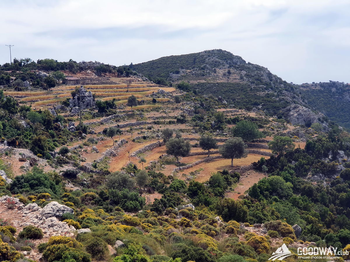 Сначала идём через огороды на террасах. Удивительно, но до сих пор здесь выращивают пшеницу! Ручная обработка и полив! Совершенно не понятно, как ретро-фермеры умудряются конкурировать с промышленным сельским хозяйством. Тропа приведёт сначала в небольшую деревню Бель, и дальше пересекаем прибрежный хребет на высоте 700м, здесь значится деревня Бельчегиз, но на деле всего 2 жилых дома. Затем спускаемся в посёлок Гавурагили, заночуем в одной из диких морских бухточек.