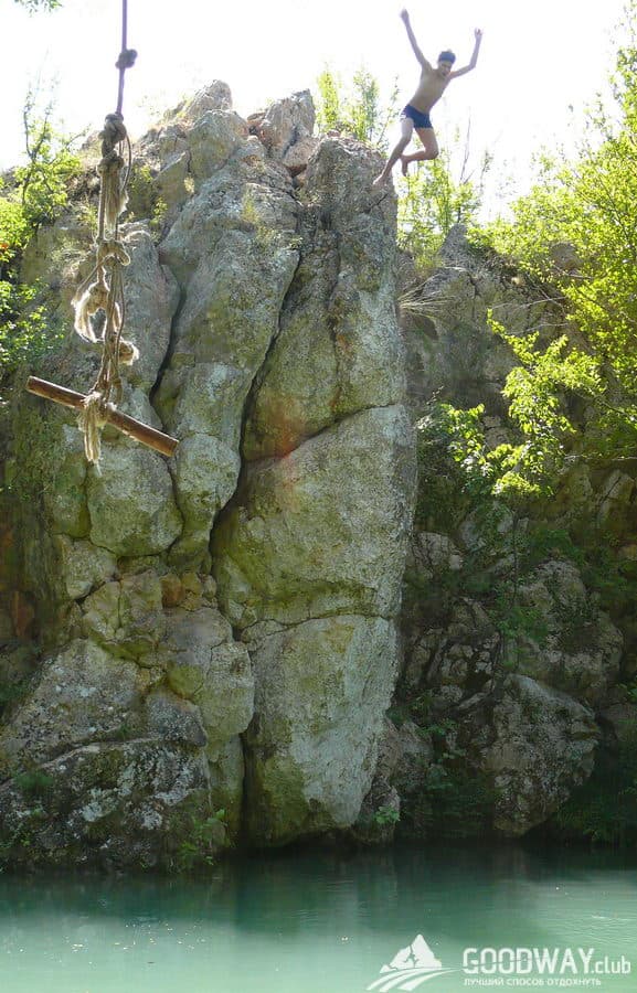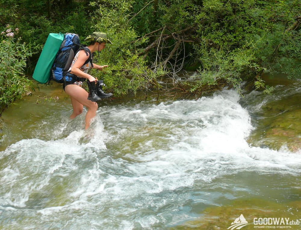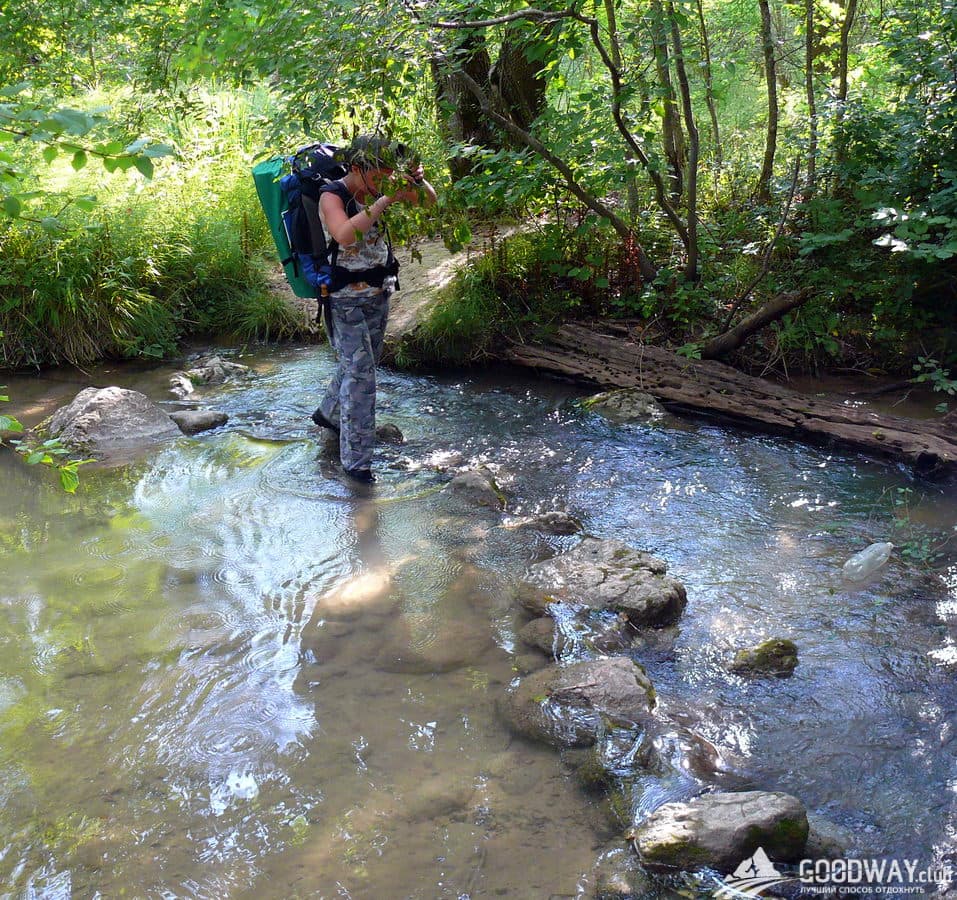 Из Морозовки спустимся в Чёрнореченский каньон: тут есть тарзанка и 7-метровая скала, с которой можно прыгать. Мы переправимся через реку по бревнам и пойдем вверх по течению. Местами каньон сужается, тропа обрывается и нам прийдется идти прижавшись к скалам, иногда даже босиком по воде. На одной из площадок у воды мы и расположимся на ночлег.