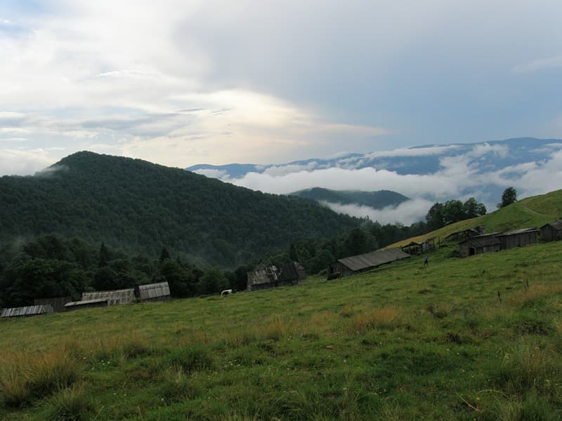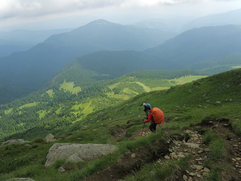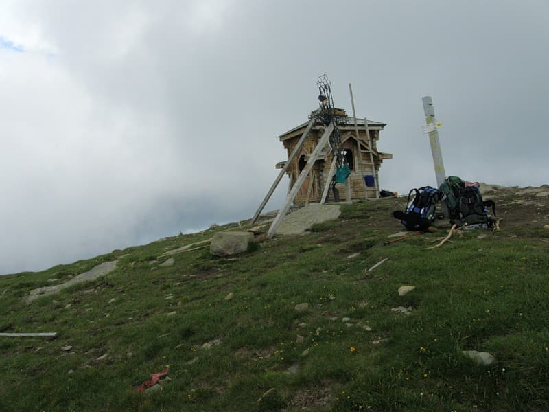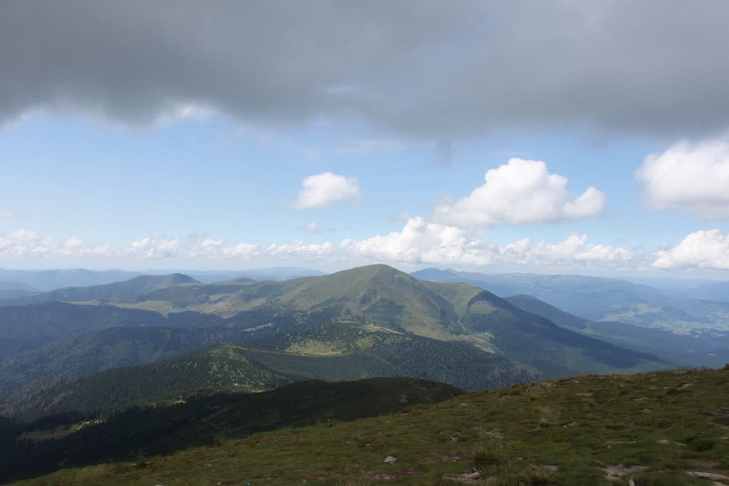 Постепенно поднимаясь, выберемся на открытый гребень. Это и есть начало Черногорского хребта. Ещё чуток попыхтим, и окажемся на г. Петрос. На вершине небольшая деревянная каплычка (часовенка) и железный крест. Видно весь Черногорский хребет, а Говерла будто и совсем в двух шагах 🙂 Но туда мы доберёмся лишь завтра, а сегодня нам хватило бы духу и сил спуститься на седловину. Спуск этот будет пожалуй, самым трудным за весь поход. В случае дождя спрячемся на ночь в пастушеском домике – коше.