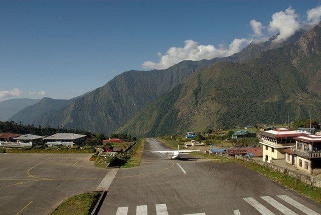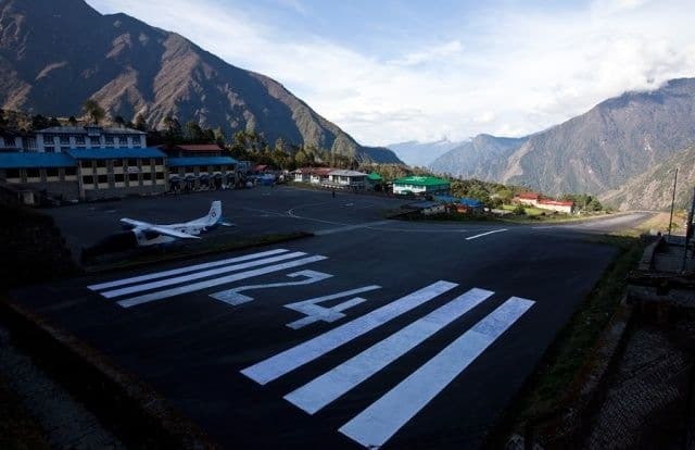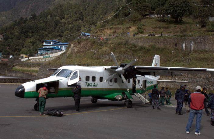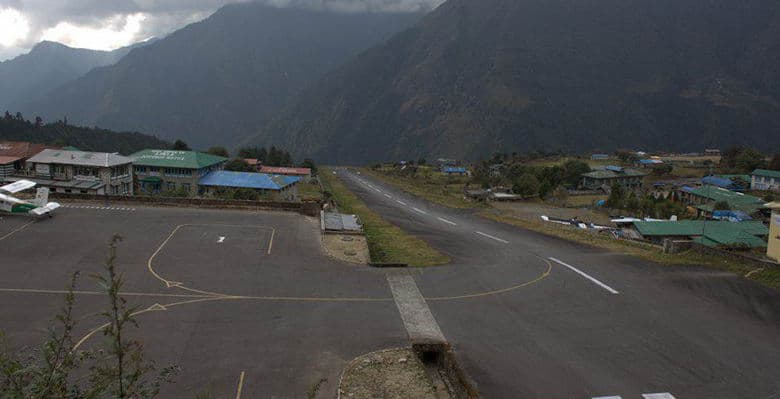 Ранним утром едем в местный аэропорт. Здесь закончится комфорт, определённость и начнутся настоящие приключения. Местный аэропорт Катманду скорее похож на межгалактическую перевалочную базу. Здесь царит полнейший хаос. Лица, голоса, одежды и потребности всех народов мира перемешались в небольшом для такой толпы душном помещении. Аэродром в Лукле не оснащён системами навигации, нет там и инженерной службы. Только диспетчер и радиостанция. Летают 18-местные канадские Оттеры производства 60-х годов прошлого века. Взлётно-посадочная полоса в 450м начинается обрывом и заканчивается скалой. Возможности зайти на второй круг при посадке или прервать взлёт у пилота нет. Однако за 40 лет разбилось всего 2 самолёта, так что сильно переживать не стоит. Полёты проводятся только в хорошую видимость, поэтому дата и время на билете условны. Сколько мы будем ждать вылета, зависит не только от погоды, но и от «связей» и удачи нашего непальского гида, которому будет поручено «пробивать» наш вылет. После прибытия в Луклу недолго отдыхаем от забавного приключения и начинаем треккинг к Эвересту. Идём в Пхагдинг. Путь будет проходить вдоль реки мимо деревень шерпов. Первые виды на высокие горы, первая переправа по подвесному мосту.