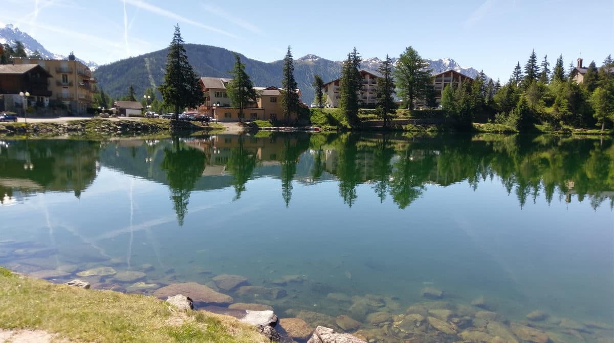 Дальше едем на автобусе до посёлка Шампе, примечательного большим озером. Оно зажато между высоких скал, а на оставшихся свободных местах вырос посёлок. Всё это смотрится просто великолепно!