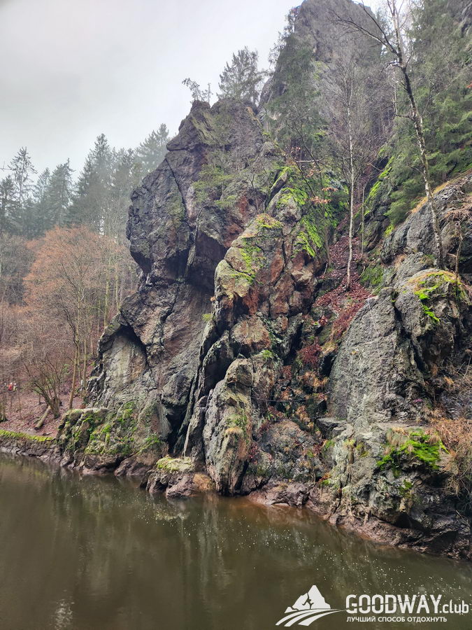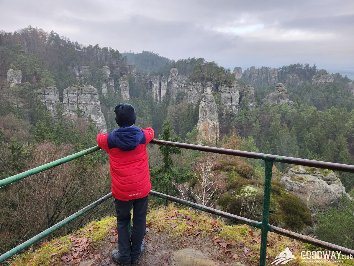 Начнём с осмотра галереи 3D картин, вырезанных в скалах. Им по 40-70 лет, а смотрятся, будто древние. Несколько десятков картин от местного мастера. Впечатляет. Дальше, через красивый лес и несколько смотровых площадок выходим к замку Груба скала. С 14 века здесь была крепость, а когда необходимость в ней пропала, перестроили в замок. Но, оставили в нём много военного духа – башни, бойницы. Смотрится отлично, и вид отсюда хороший!