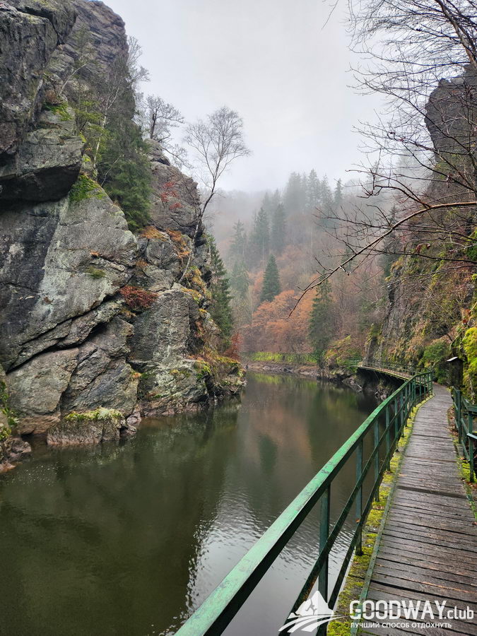 Далее спускаемся в каньон реки Йизера, и пройдёмся по петляющей тропинке вдоль берега, наслаждаясь шумящими порогами, видами со смотровых и скалами.