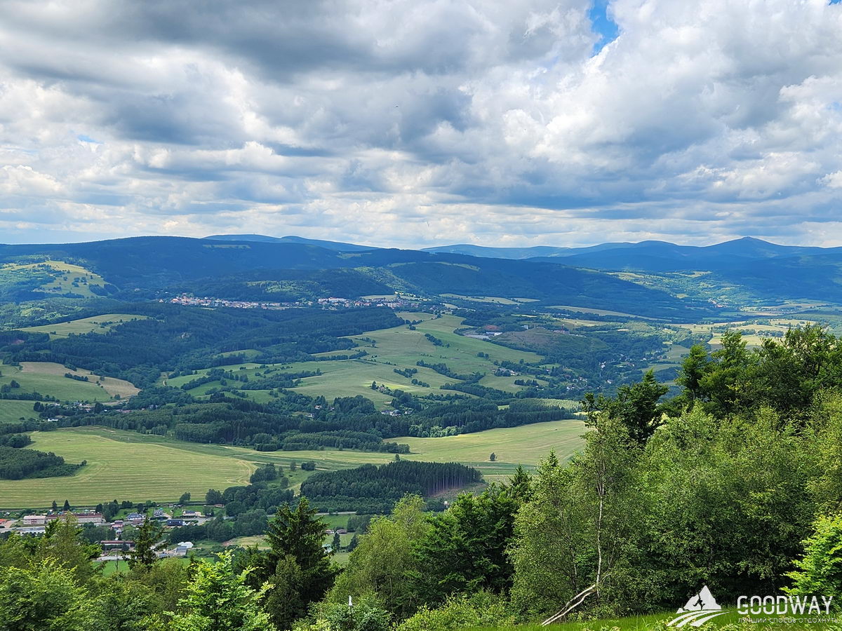 С утра нам предстоит крутой подъём на гору Снежка, 1605м. Это высшая точка Чехии и Крконошских гор. Здесь также проходит граница Польши и Чехии. Пирамидальная гора имеет плоскую и большую вершину, поэтому каждая страна отметилась как могла. Поляки построили здания, напоминающие летающие тарелки, а чехи часовню, магазин, смотровую площадку и канатную дорогу. Здесь всегда людно. Прекрасные виды во все стороны.