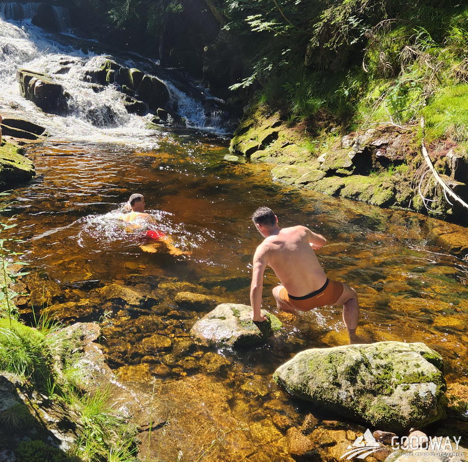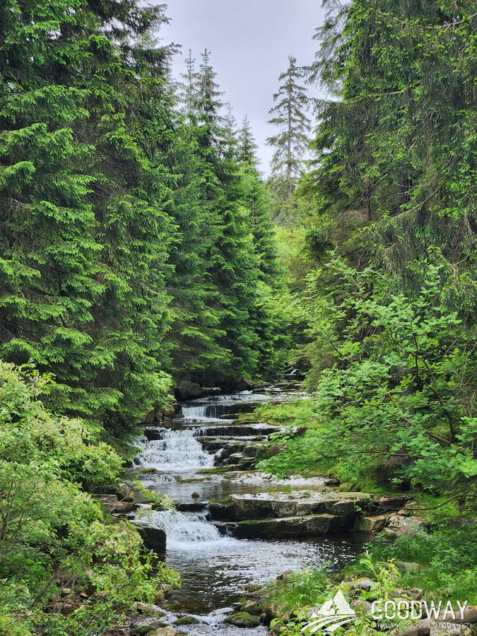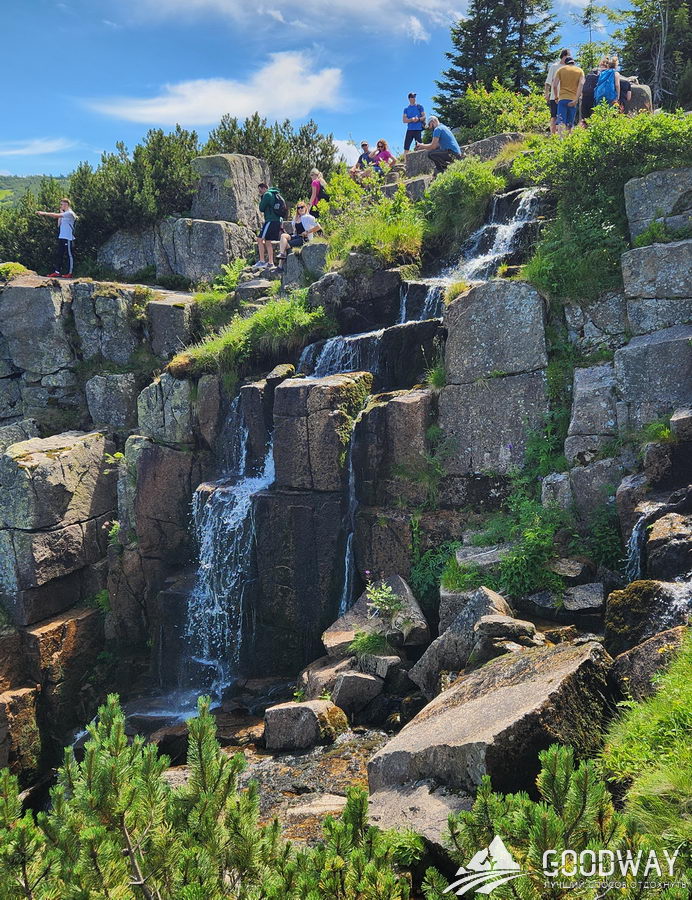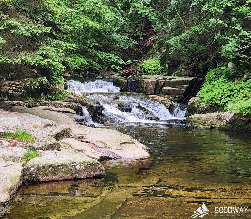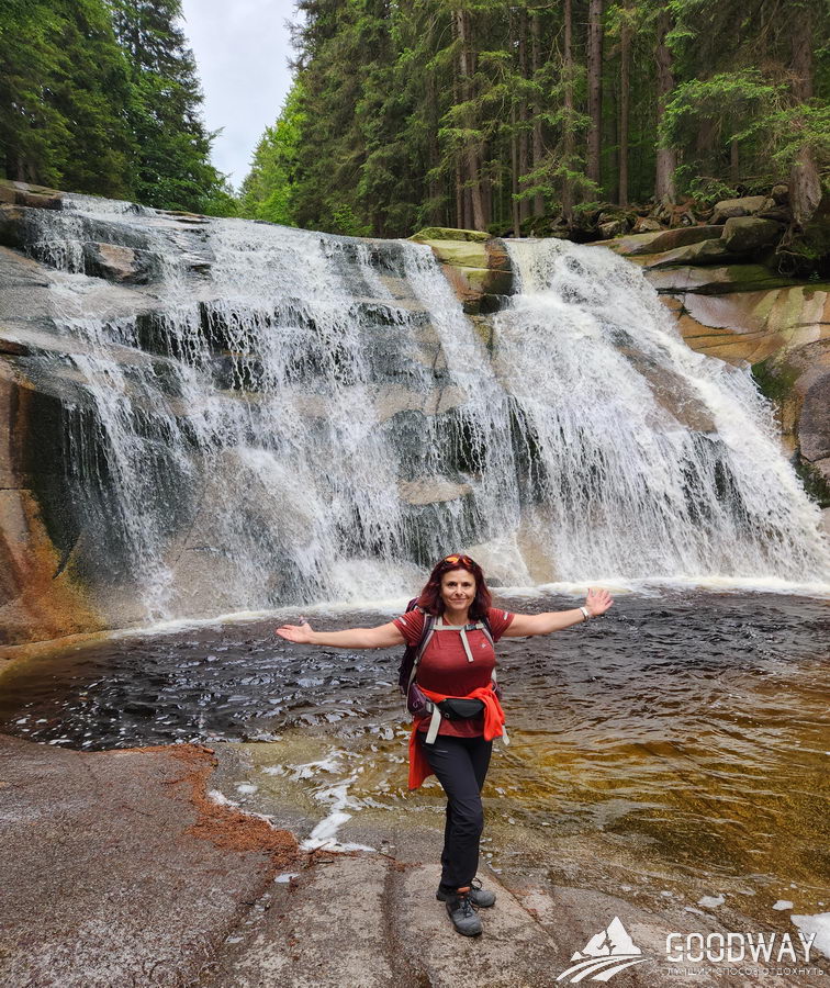 Переезжаем в Гаррахов и начинаем поход. Предстоит долгий, сложный и очень красивый день. Тропа петляет по лесу вдоль реки Мумлава, и вскоре мы выходим к Мумлавскому водопаду, самому полноводному в Чехии. С высоты 10 метров широким потоком вода стекает в котловину. Дальнейшие 4 км будем подниматься в горы рядом с шумной Мумлавой, и увидим ещё несколько водопадов поменьше. Попадаются и достаточно глубокие места, можно купаться.
