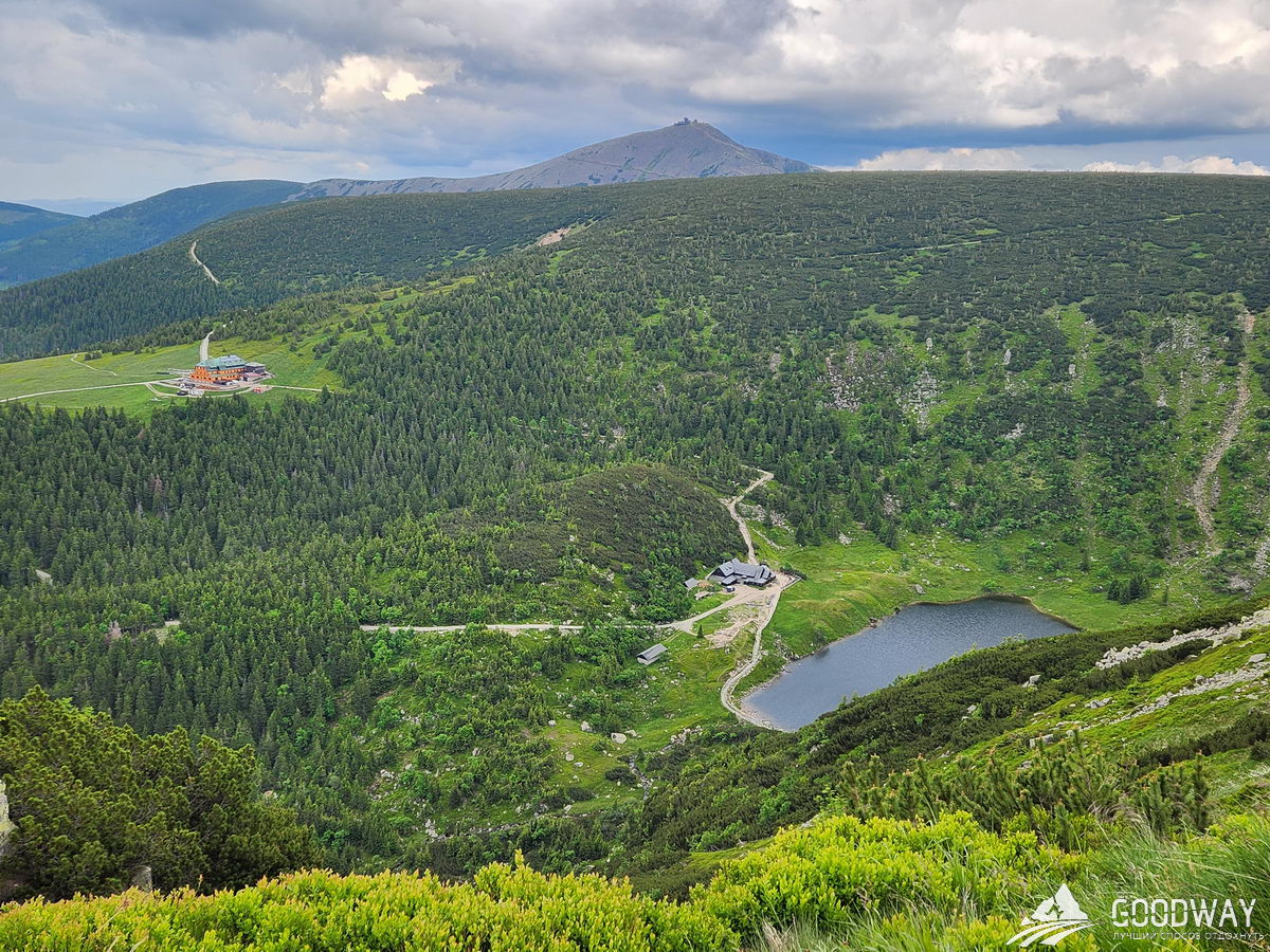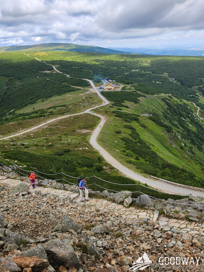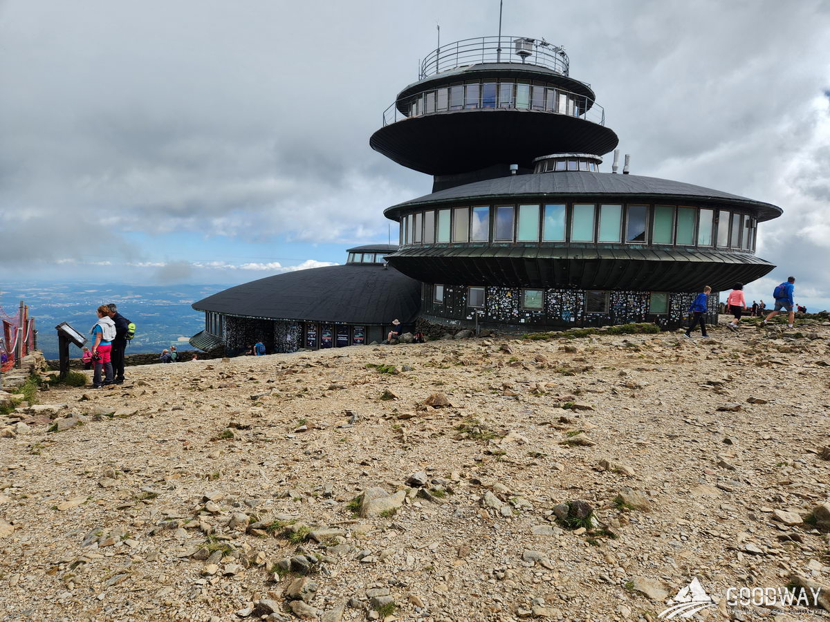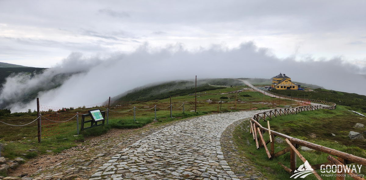С утра нам предстоит крутой подъём на гору Снежка, 1605м. Это высшая точка Чехии и Крконошских гор. Здесь также проходит граница Польши и Чехии. Пирамидальная гора имеет плоскую и большую вершину, поэтому каждая страна отметилась как могла. Поляки построили здания, напоминающие летающие тарелки, а чехи часовню, магазин, смотровую площадку и канатную дорогу. Здесь всегда людно. Прекрасные виды во все стороны.