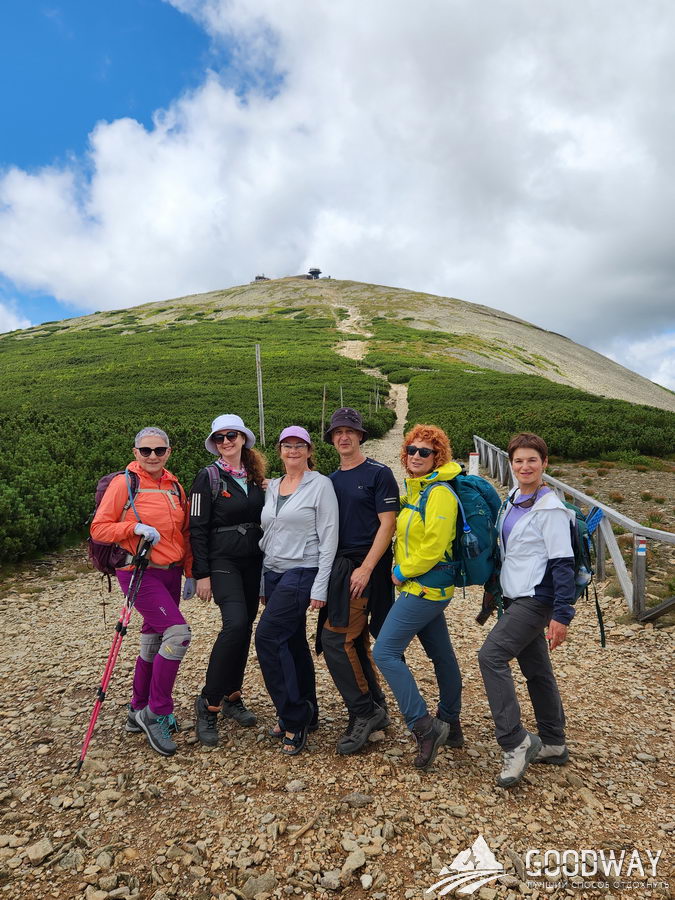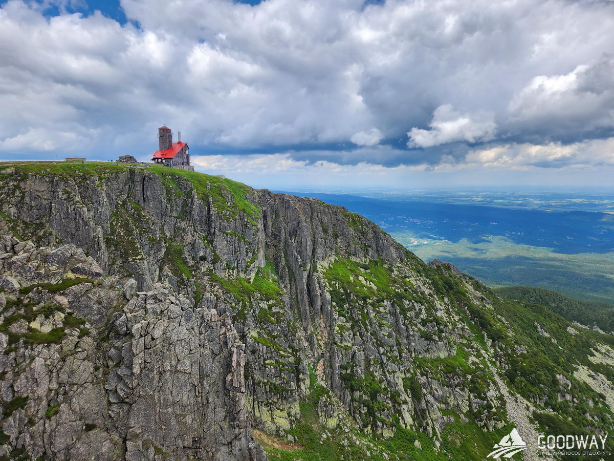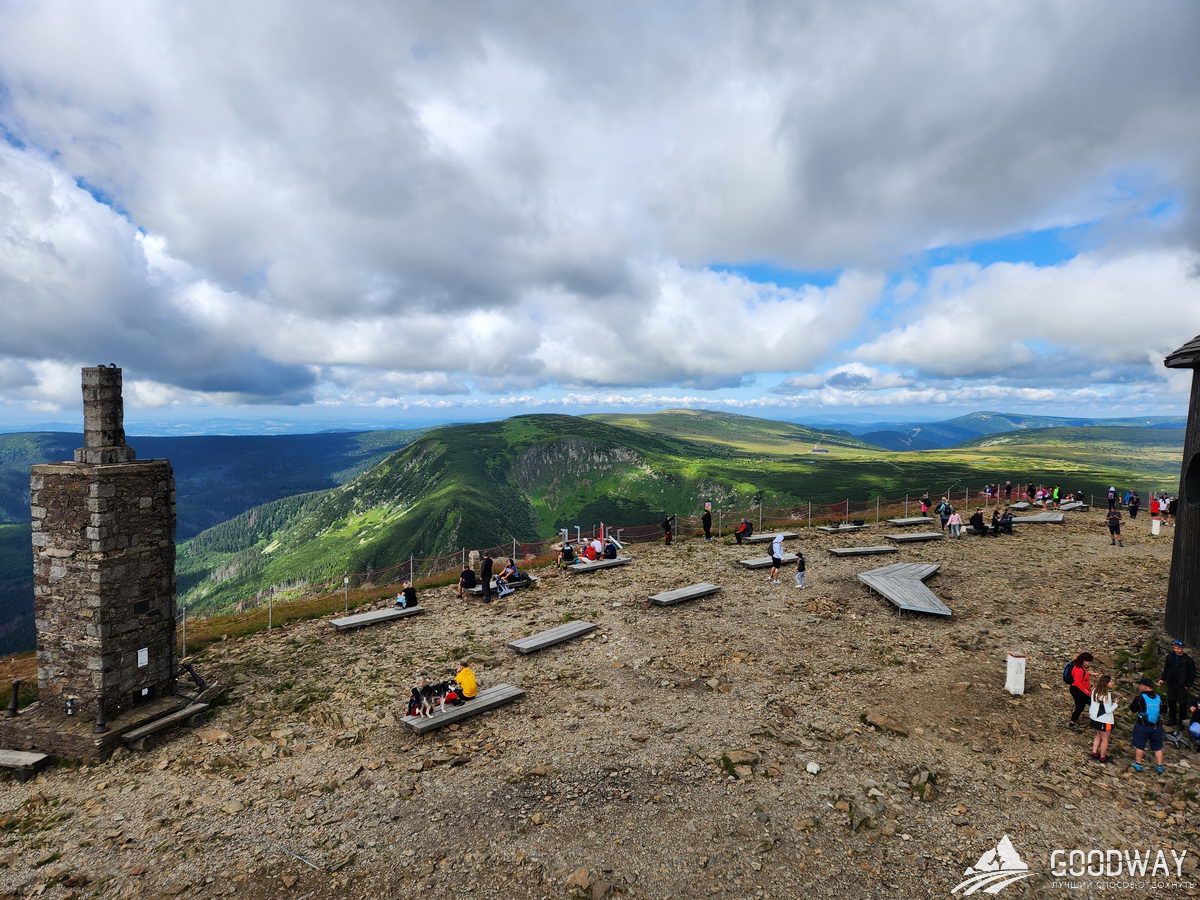 С утра нам предстоит крутой подъём на гору Снежка, 1605м. Это высшая точка Чехии и Крконошских гор. Здесь также проходит граница Польши и Чехии. Пирамидальная гора имеет плоскую и большую вершину, поэтому каждая страна отметилась как могла. Поляки построили здания, напоминающие летающие тарелки, а чехи часовню, магазин, смотровую площадку и канатную дорогу. Здесь всегда людно. Прекрасные виды во все стороны.