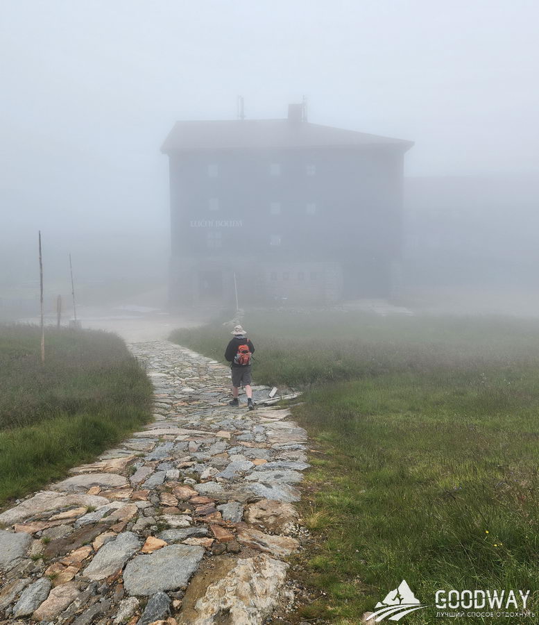 Далее выходим на границу Чехии и Польши, которая здесь проходит по Крконошскому хребту на высоте 1450м. Горы, скалы, суровое здание метеостанции и огромные просторы. С одной стороны – Польша, с другой – Чехия. Тропа идёт прямо по пограничным столбам. На ночёвку немного спустимся в горный приют.