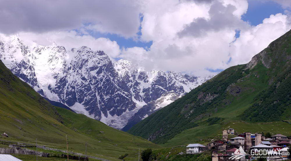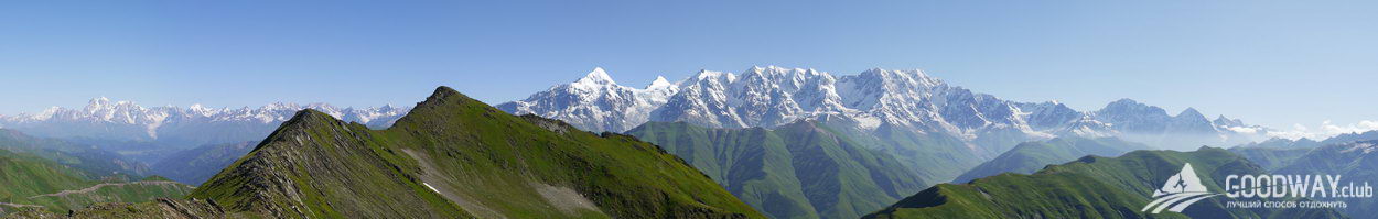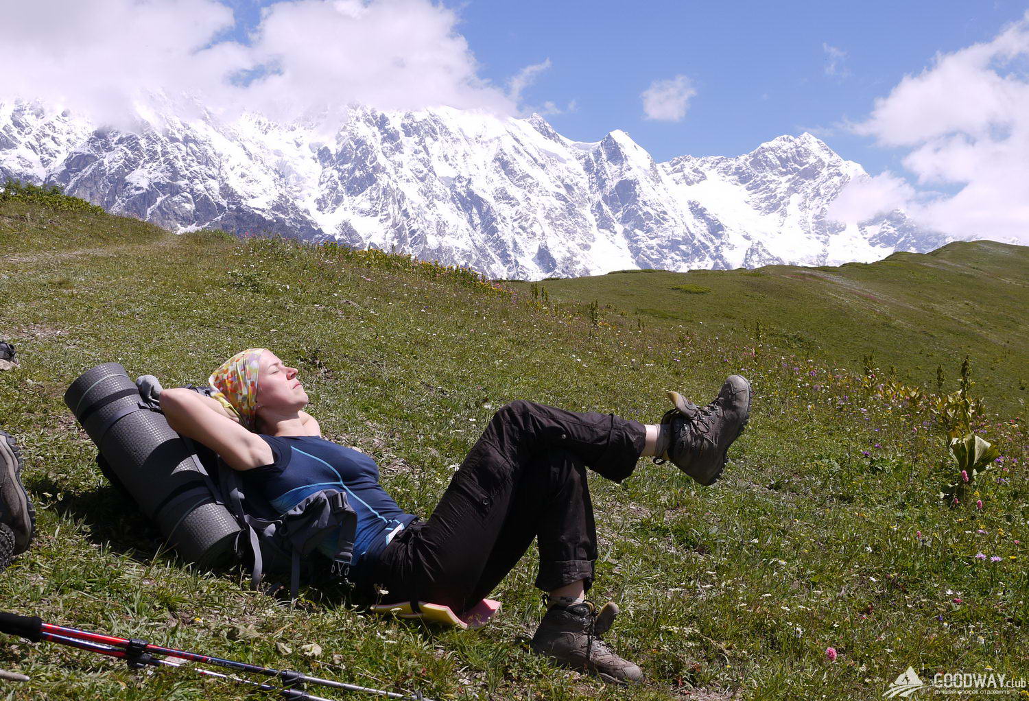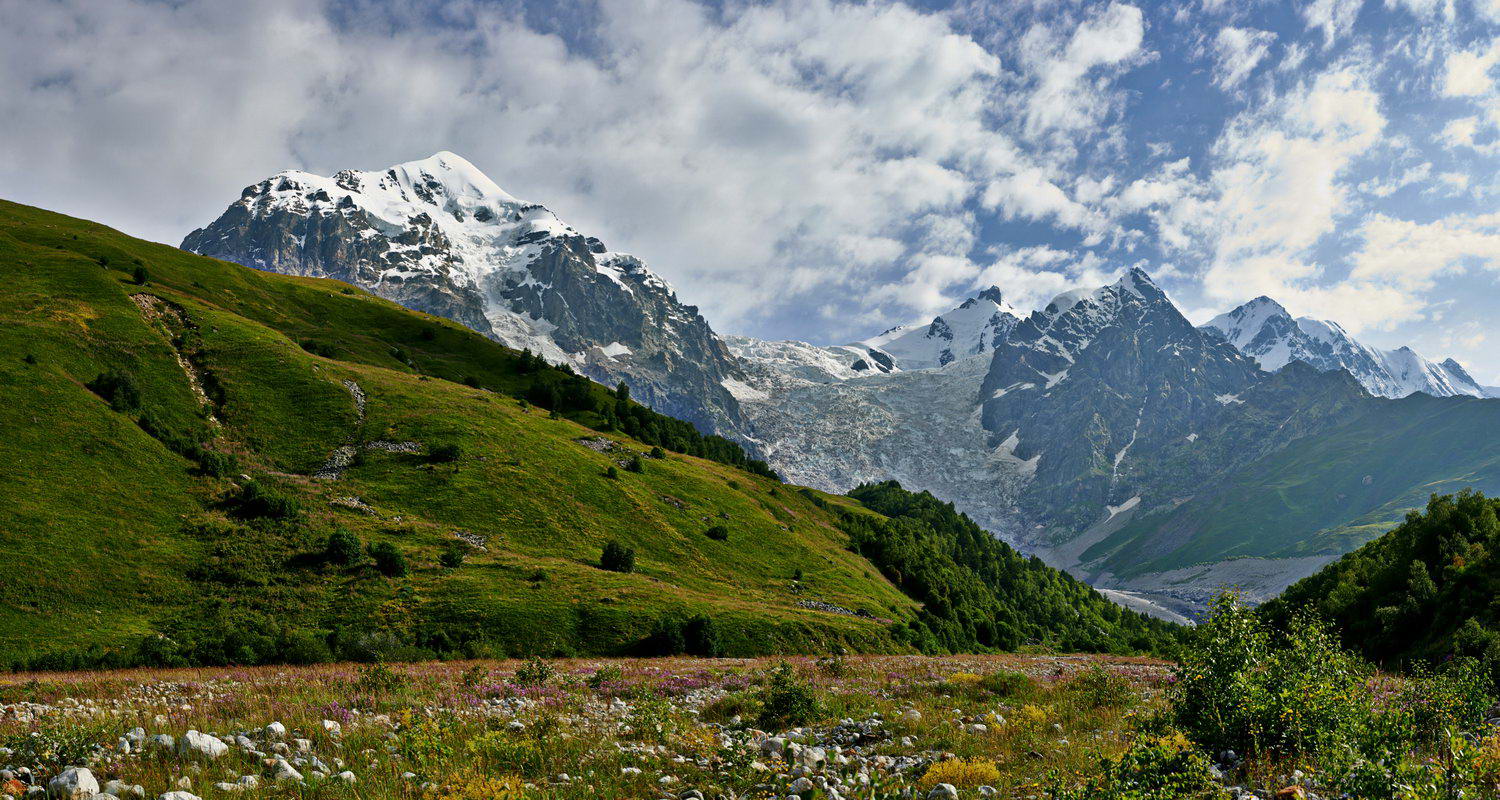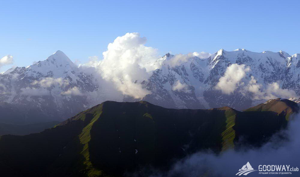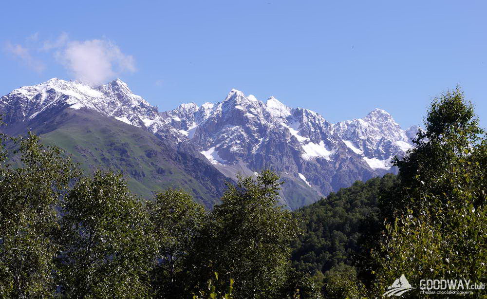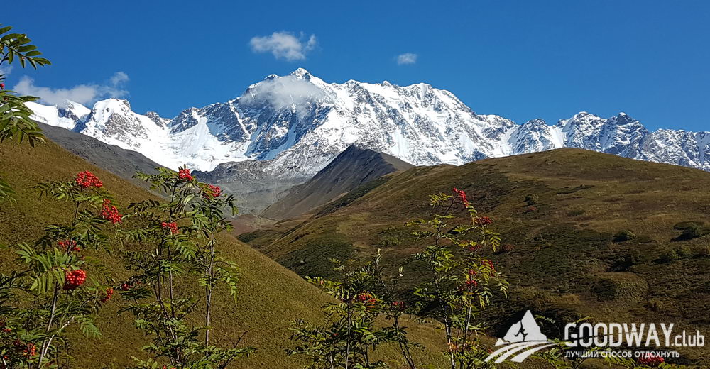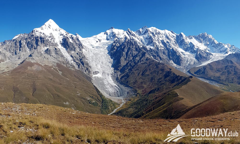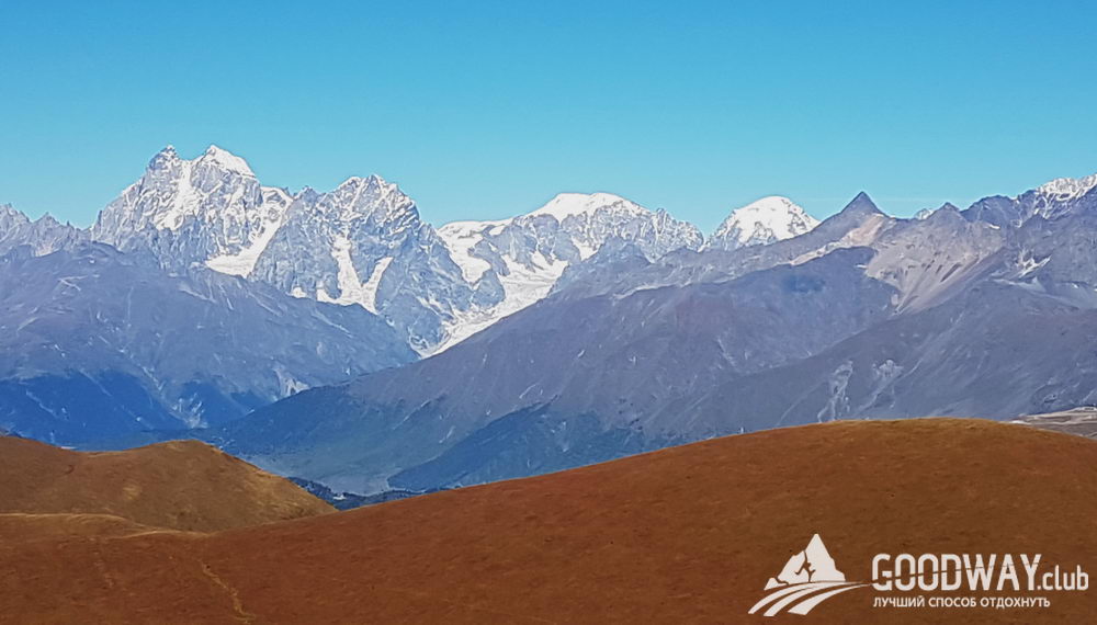А чтобы увидеть ещё больше, заберёмся ещё выше — на гору Чхундери высотой 3019м. Отсюда открывается самый потрясающий на всём маршруте вид! С одной стороны Ушба, Эльбрус, с другой Тетнульд и Безенгийская стена во главе со Шхарой (5193м), наивысшей точкой Грузии. И вы стоите внутри всего этого великолепия!