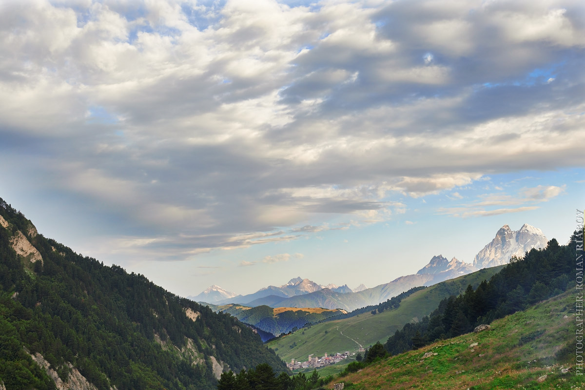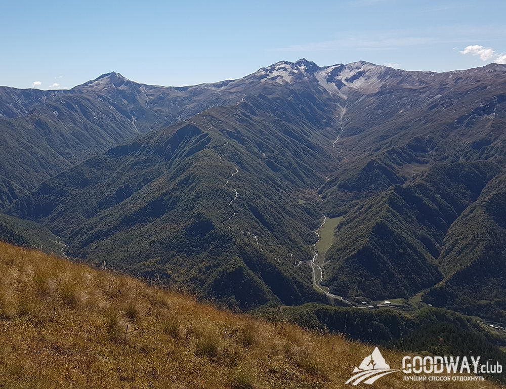 Оставляем в кемпинге всё, без чего можно в походе обойтись, и выходим на тропу. Постепенно и мягко поднимаясь, выйдем на перевальчик высотой 1890м. Отсюда открываются первые панорамные виды и снежные вершины: впереди гора Тетнульд 4850м и под ней посёлки в долине, а позади ушастая Ушба 4700м. С перевала виден весь дальнейший путь и даже полянка в лесу где будет лагерь с видом на Ушбу.