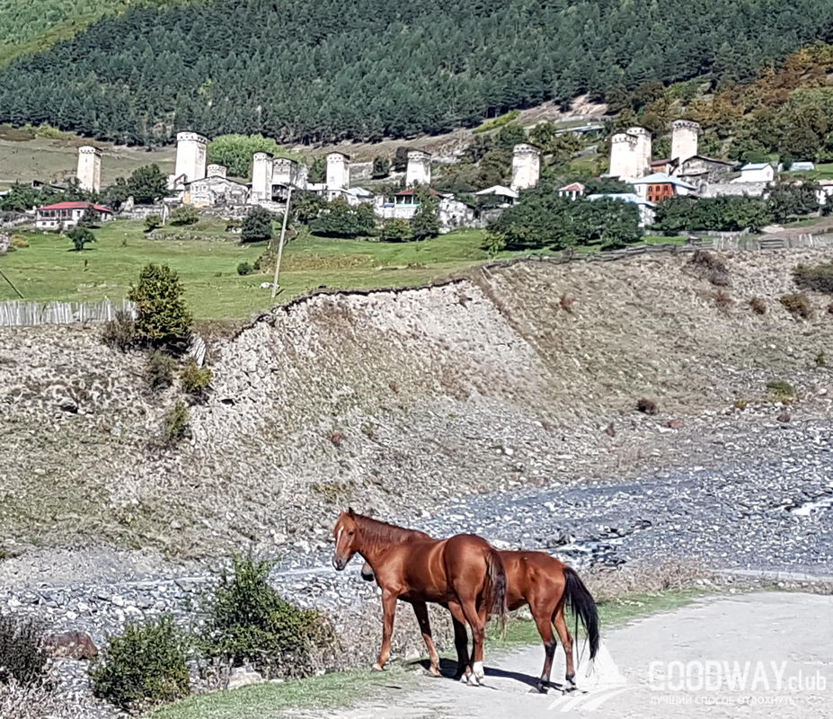 Так трудно словами описать ту красоту природы Грузии. Я иногда так засматривалась, что падала или спотыкалась о землю. Вот будто бы идешь по одной местности, а вдалеке другие горы как прилегающая картинка или заставка из photoshop, или внезапно из ниоткуда внизу виднеется средневековая деревушка со старыми сванскими башнями. Просто обворожительно! Не хватает всадников на конях… Хотя коней и коров на отдыхе в Грузии мы увидели бесчисленное множество. Мы решили, что они особые и главные жители, потому как ходят и делают, что хотят и где хотят (даже на проезжей части).