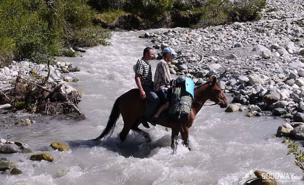Сегодня предстоит перейти вброд бурную горную речку Адишчала. Это не составит труда, если вода не очень большая. Но иногда приходится прибегать к помощи лошадей (услуга платная, 5долл/чел). На подъёме к перевалу Чхундери откроется во всей своей грандиозности крупнейший ледопад Кавказа – Адиши. Его высота 1.5 километра! Подобное можно увидеть только в Гималаях на подступах к Эвересту. Частенько из ледопада доносится гул движущихся ледяных глыб, и весь подъём на перевал мы будем оборачиваться на этот звук горного величия. Кроме ледопада здесь нам откроется и Тетнульд – очень красивая пирамидальная вершина. Подъём на перевал как всегда не из лёгких и как всегда красивейшая панорама гор в награду. Уже не буду придумывать всякие сравнения и эпитеты, перечислять сложные грузинские названия – все равно эту красоту словами или фотографиями передать не получится. Только увидеть!