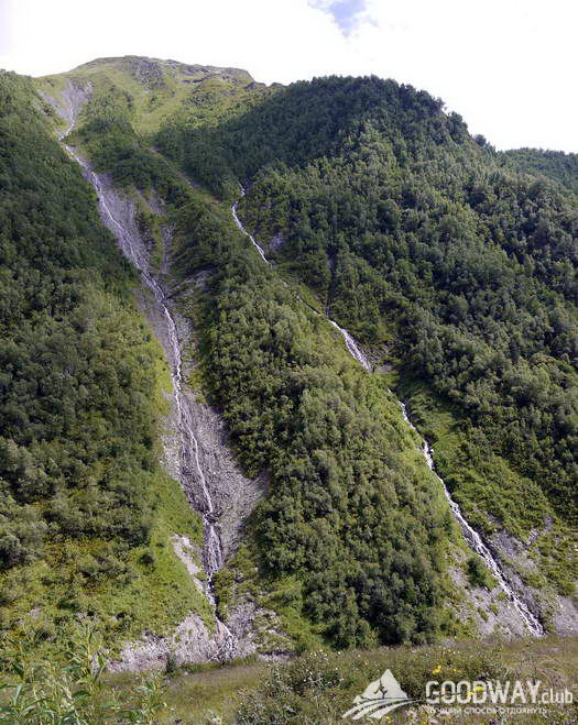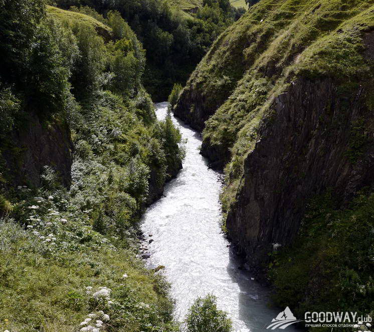 Сегодня предстоит перейти вброд бурную горную речку Адишчала. По веревочным перилам это не составит труда, если вода не очень большая. Но иногда приходится прибегать к помощи лошадей. На подъёме к перевалу Чхундери откроется во всей своей грандиозности крупнейший ледопад Грузии – Адиши. Его высота 1.5 километра! Подобное можно увидеть только в Гималаях на подступах к Эвересту. Частенько из ледопада доносится гул движущихся ледяных глыб, и весь подъём на перевал мы будем оборачиваться на этот звук горного величия. Кроме ледопада здесь нам откроется и Тетнульд – очень красивая пирамидальная вершина. Подъём на перевал как всегда не из лёгких и как всегда красивейшая панорама гор в награду. Уже не буду придумывать всякие сравнения и эпитеты, перечислять сложные грузинские названия – все равно эту красоту словами или фотографиями передать не получится. Только увидеть!