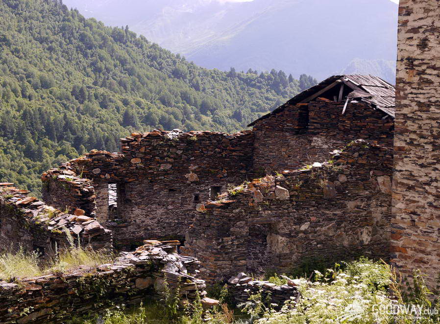 С утра небольшой подъёмчик – и мы вновь очарованы горными видами. По приятной тропе спустимся в деревню Адиши. Если не считать проводов и пары спутниковых тарелок, здесь все также, как и 500 лет назад! И это не средневековые руины, и не музей или кинопостановка! Это реальная жизнь!!! Узкие улочки из навоза и камней, закопченные башни и дома, каменные заборы сложенные без раствора, повсюду хрюшки и коровы, главный вид грузового транспорта-волокуши, запряжённые волами, а пассажирского-лошади. Окружающие горы были естественным препятствием к проникновению сюда цивилизации. Колесо «докатилось» в Верхнюю Сванетию только в 1937 году… Вобщем-то, по старым улочкам оно и сейчас не особо катится. Но горный кордон уже прорван современными дорогами, и древний уклад жизни быстро разрушается. Спешите увидеть все как было своими глазами!