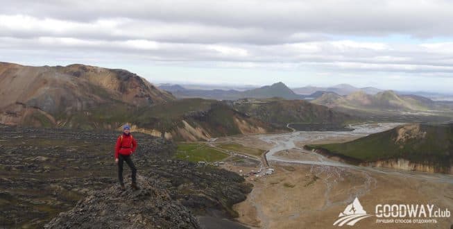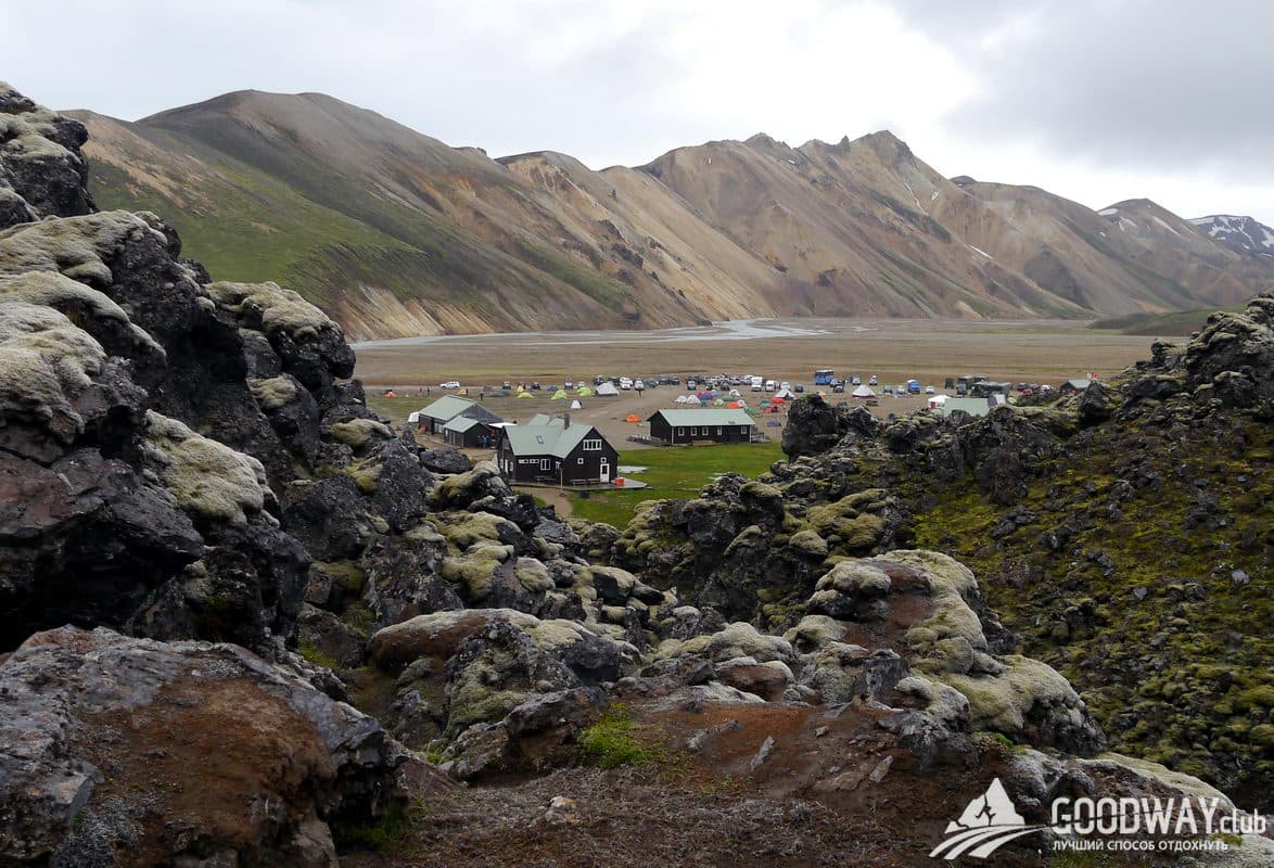 В кемпе Landmannalaugar ставим палатки и идем в радиалку на вулкан Bláhnjúkur (Блахнюкюр — «голубой пик», высота 940 м). Виды оттуда замечательные: разноцветные горы опутаны «сосудами» рек. В небо поднимаются столбы дыма из серных источников. Возвращаемся в кемп через равнину, усеянную «вулканическими бомбами». Здесь можно внимательно рассмотреть, как они устроены. Вдоль тропы встречаются необычные растения, надписи на табличках просят не наступать на них. По возвращении купаемся в термальной реке. Очень приятно, расслабляет, похоже на сауну.