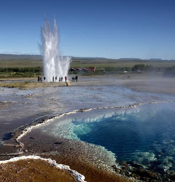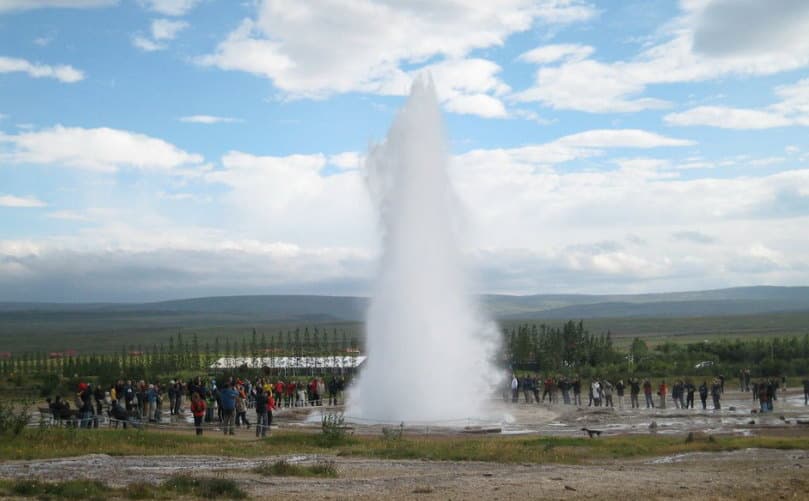 Объезжаем на автобусе места с открыток. Посещаем долину гейзеров со знаменитым Строккюром, который каждые семь минут выбрасывает фонтан высотой до 30 метров. Раньше действовал ещё более высокий, но посетители забросали его монетами, и чудо закончилось.