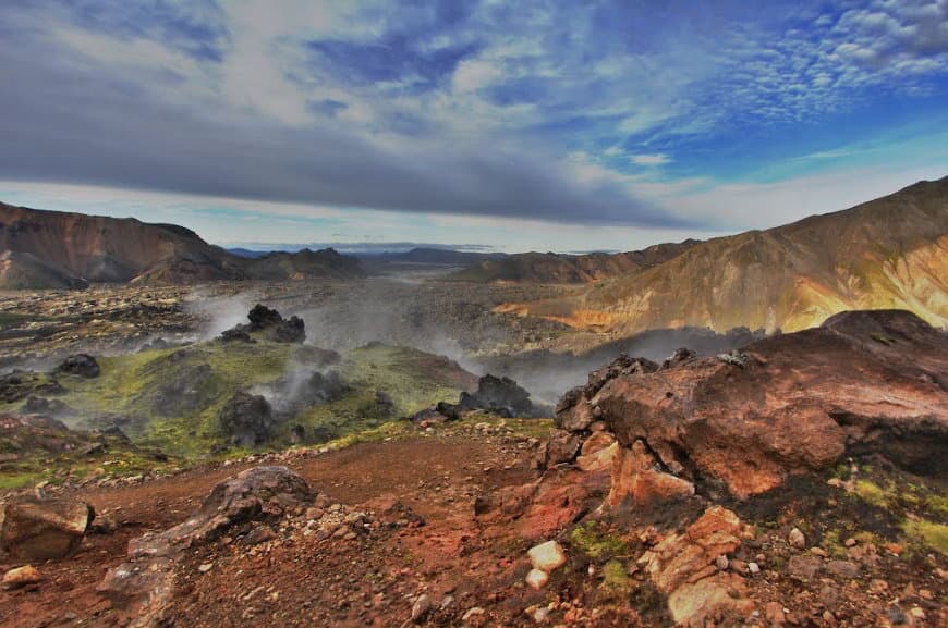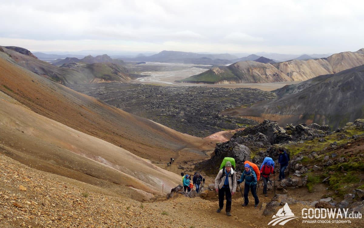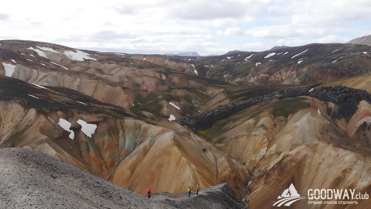 Идём среди цветных гор, мимо вулканических бомб, причудливых скал и столбов дыма. Делаем радиалку на вершину вулкана Brennisteinsalda — «серная волна». Склоны его напоминают пирог с цветными коржами. Это самая разноцветная гора Исландии.