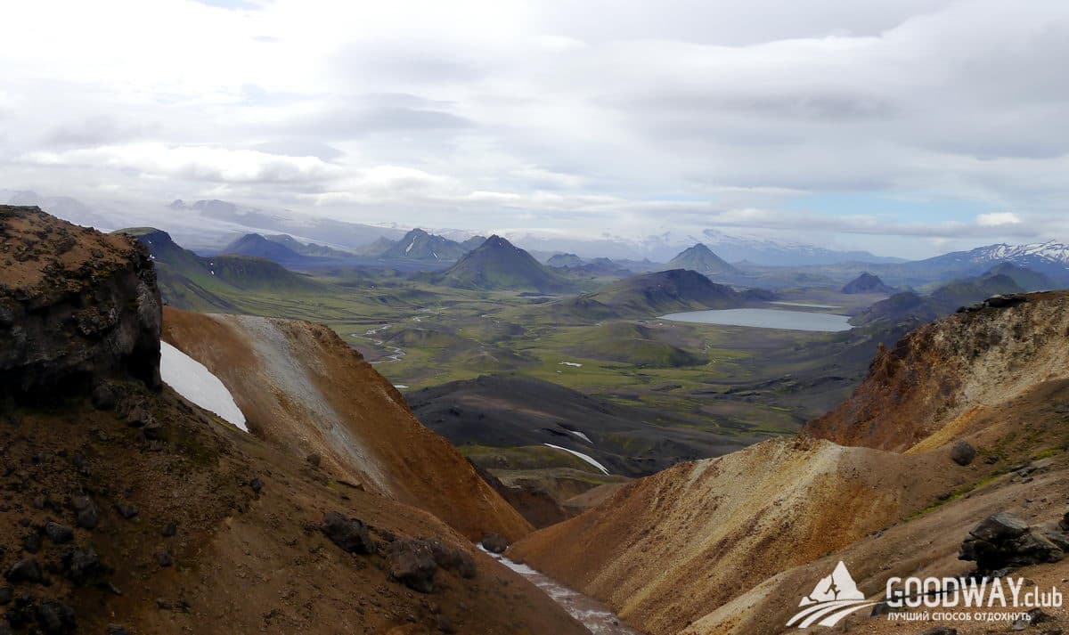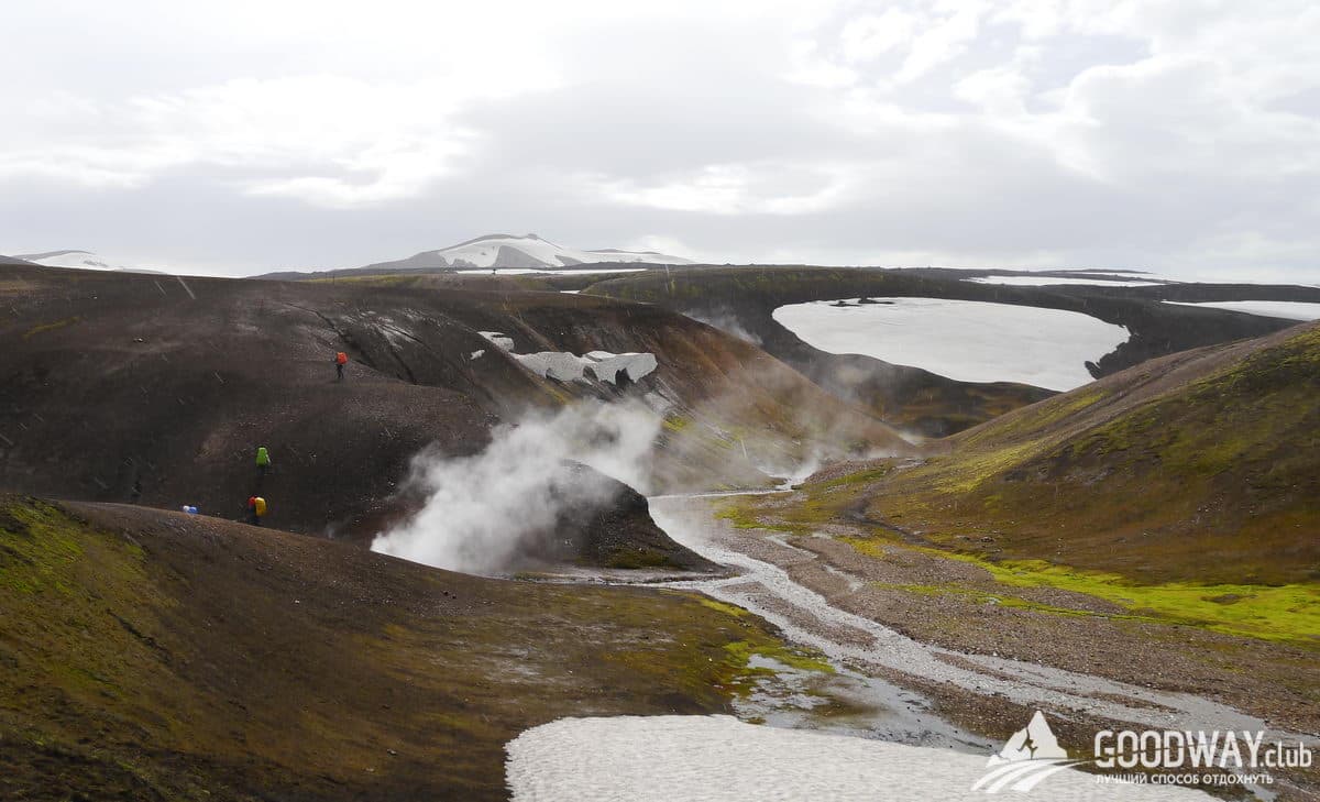 Заканчиваем переход по плато, фотографируемся с видом на разноцветные горы и переходим к следующему ландшафту – «земле Санникова». Это долина среди вулканических конусов, край тепла и озёр. Пообедаем с видом на неё, возле очень красивых скал. Рядом – горячие источники, сварим в них яйца, прихваченные из Рейкьявика. Спустимся в долину удобной тропой, и, делая тысячу фоток, дойдём до очаровательного кемпа «Лебединое озеро». Искупаемся и постираемся, подзарядим телефоны и фотоаппараты.