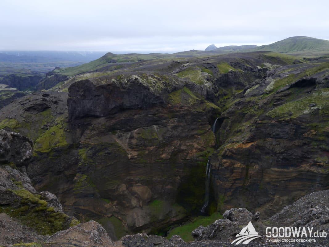 В кемпе Ботнар (Estrum) принимаем горячий душ и отправляемся в радиалку к огромному каньону Markarfljótsgljúfur. На стене его видно каменное лицо тролля.