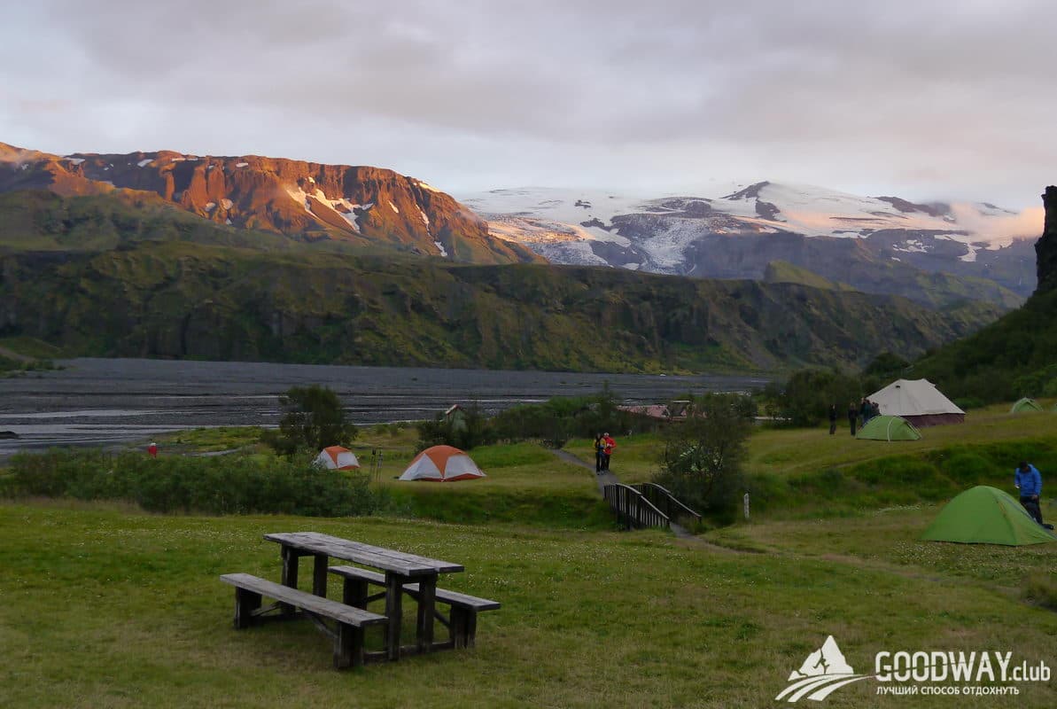 Ночуем в большом лесу из карликовых берез (Tórsmörk — «лес Тора»), вдохновившем господина Толкиена на создание «Хоббита». Готовим ужин с грибами и стараемся не пропустить момент, когда заходящее солнце окрасит ледник золотом – волшебное зрелище.