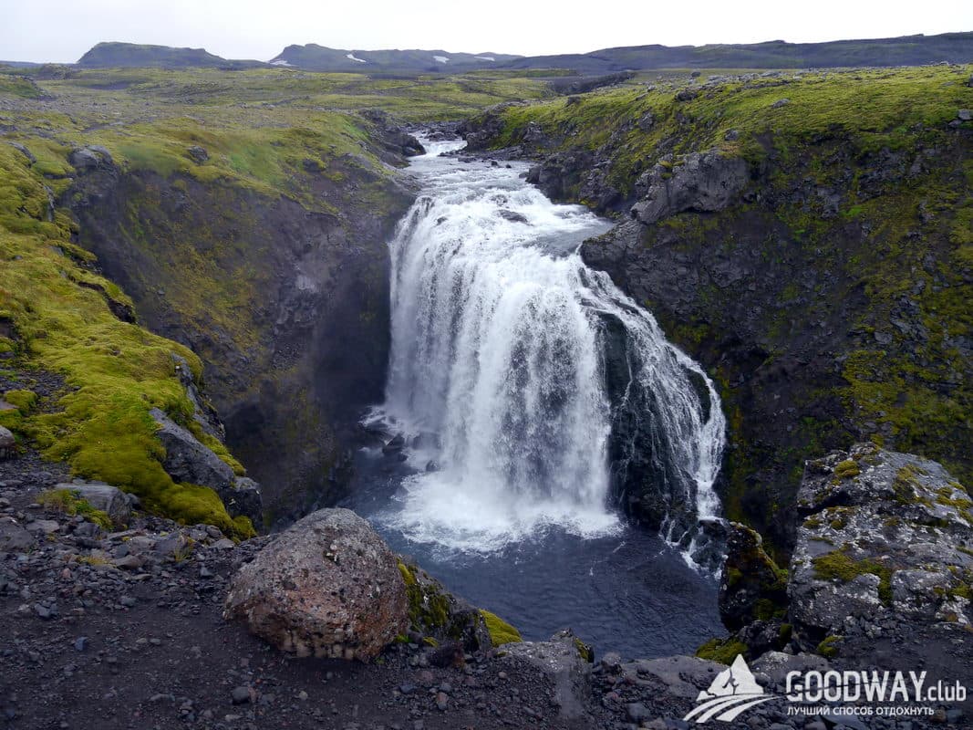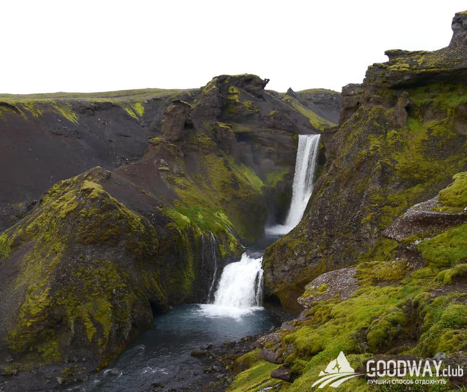 Спускаясь с плато, подходим к жемчужине нашего трека – водопадам реки Скоуга. Шаг за шагом будем наблюдать волшебные изменения природы и прикоснемся к тайне рождения рек. Увидим, как первые струйки ледниковой воды наполняются силой и вот уже несутся белыми бурунами среди черных скал. Чем ниже по течению, тем больше изумрудной зелени, причудливых мхов и цветов. Десятки радуг создают волшебное шоу. Белые овечки гуляют здесь семьями, совсем не боясь людей, и дополняют идиллическую картину.