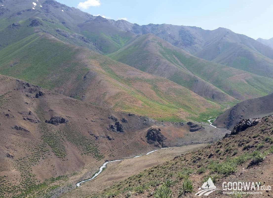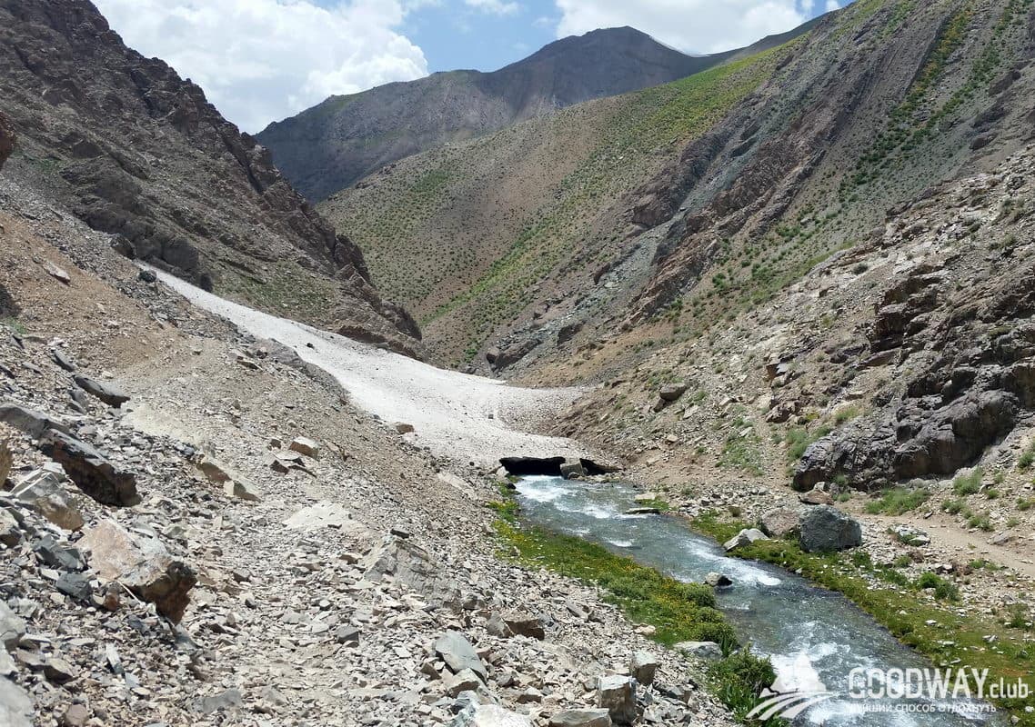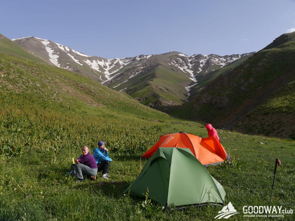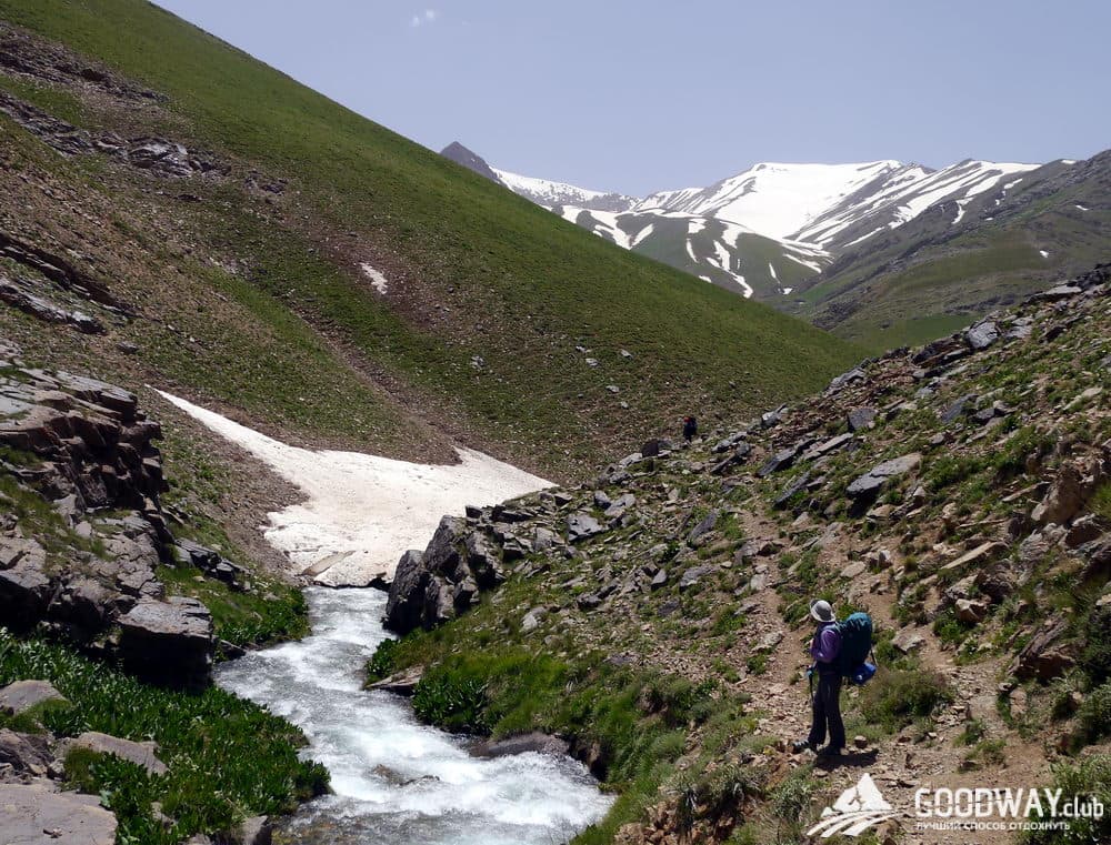 Плавный подъём по хребтам и альпийским лугам выведет нас к большой зелёной поляне. Родника тут нет, зато есть огромный снежник, который и питает зелень. мы тоже будем из него добывать воду.