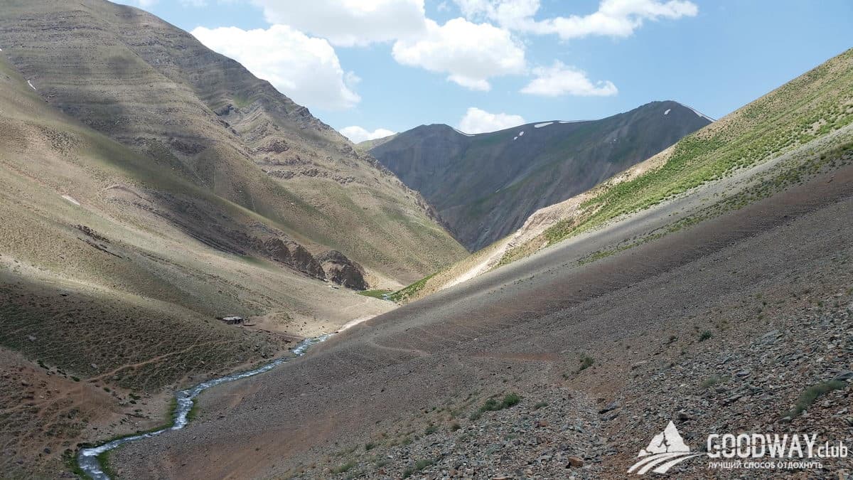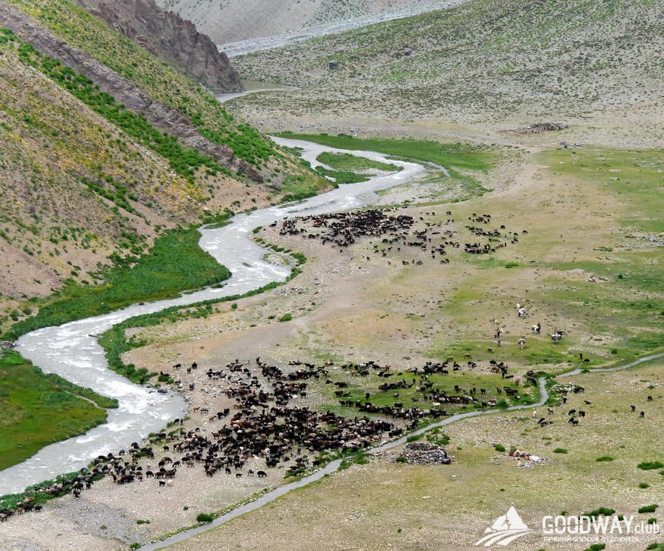 Плавно поднимаемся на перевал высотой 3560м. По очереди открываются красивые виды на долину с речкой и отарами овец. Всё это на фоне заснеженных гор, фоток от души нащёлкаете! Затем спускаемся с перевала в соседнюю долину, тут тоже речка и пастухи. Лагерь устроим возле воды.