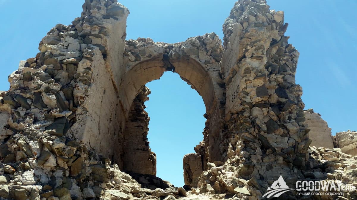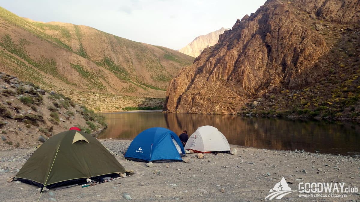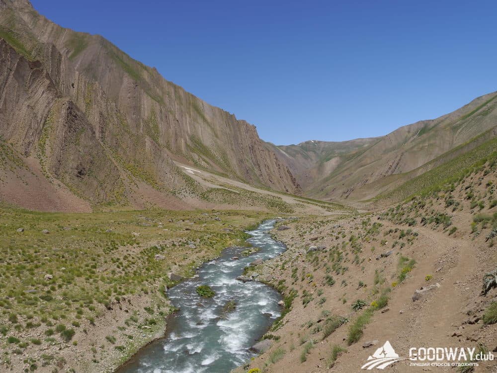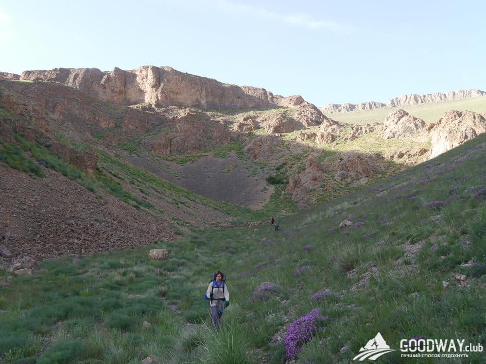 С утра у нас будет интересная траверсная тропа, и виды с неё тоже интересные. Увидим разноцветные скалы. Затем продолжим спуск по хребту и с небольшими спусками/подъёмами окажемся на горе Кале-Дохтар высотой 3220м. На вершине есть остатки крепости, кое-где и потолок сохранился. Отдохнём там. И затем снова спуск на стоянку, к живительному источнику.