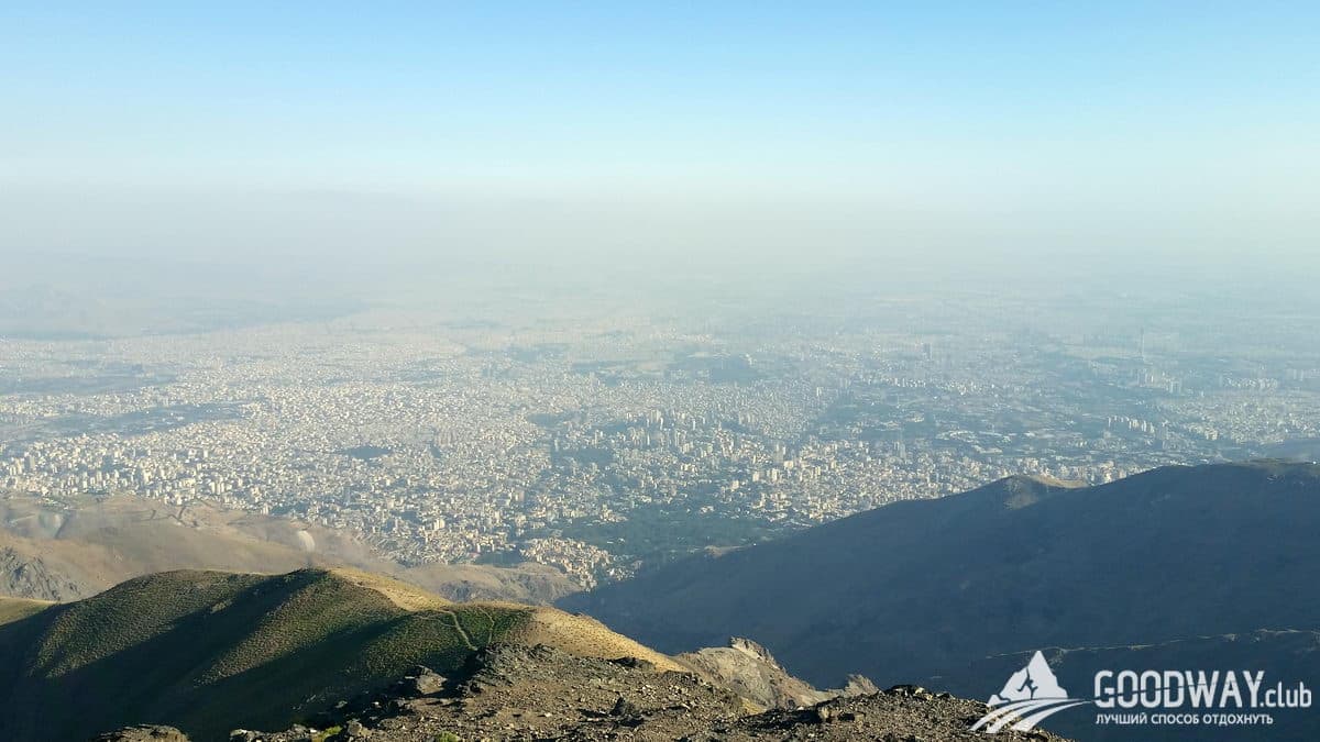 Небольшой подъём, и мы в оазисе цивилизации. Здесь верхняя станция канатной дороги, на ней поднимаются прямо из Тегерана толпы желающих «покорить» нависающий над столицей пик Точал. Мы же по этой канатке будем спускаться. Но сначала сбегаем в радиалку на вершину, это ещё 200м подъёма. Оттуда прекрасный обзорный вид, кажется рукой подать до Демавенда, и Тегеран лежит прямо под ногами.
