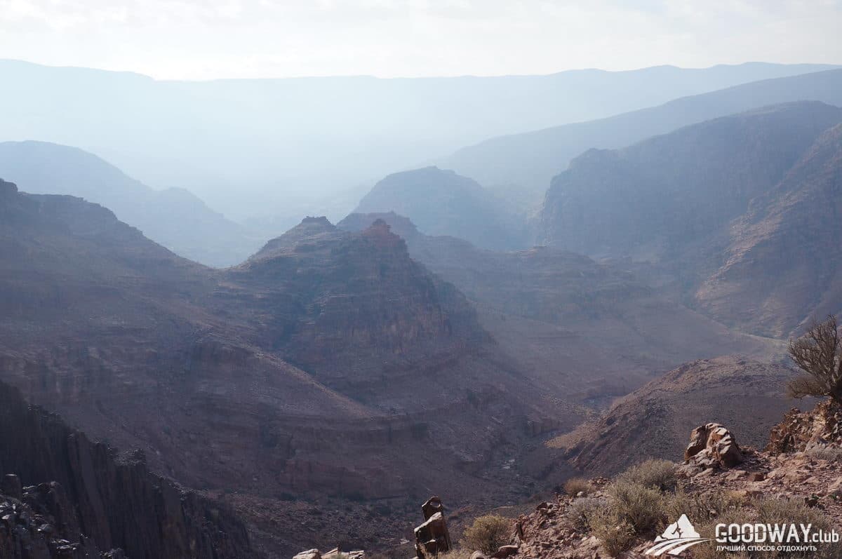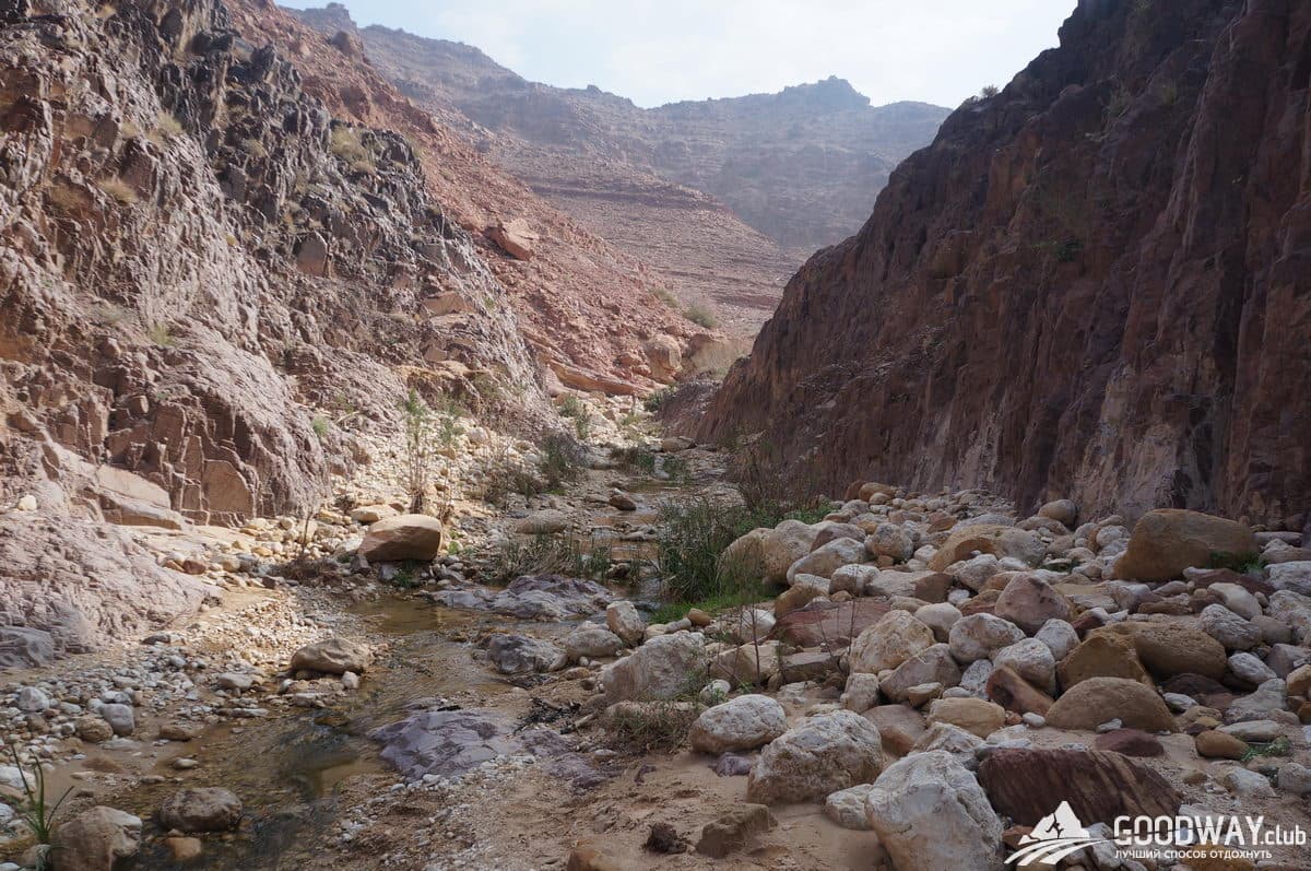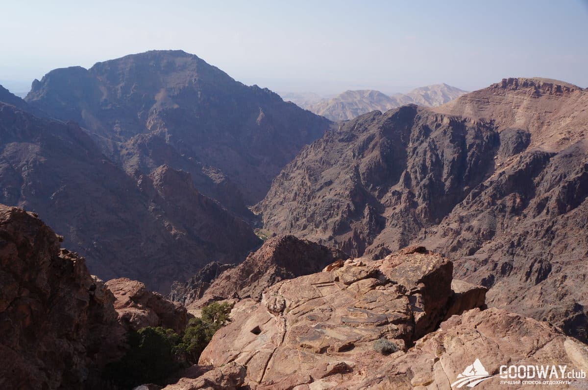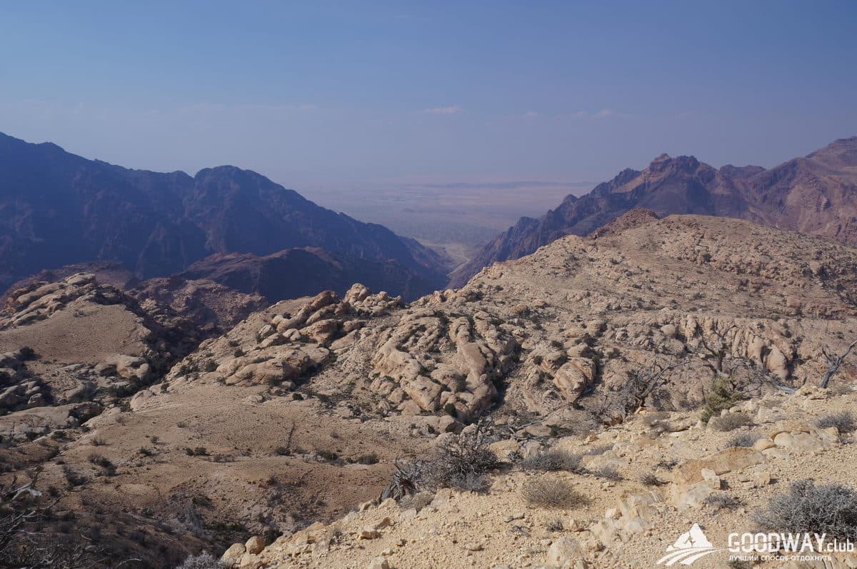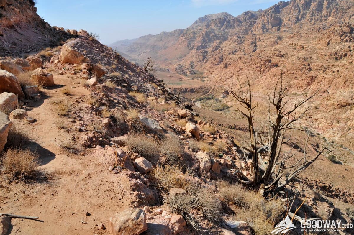 Сначала пройдёмся по долине, затем нас ждет подъём. По хорошо протоптанной тропе, проходящей то по склону, то по кулуару, нам предстоит подняться на перевал. Несколько часов упорно лезем вверх. Виды постоянно меняются, и наконец, на перевале потрясающая панорама во все стороны. Короткая фотосессия и начинаем спуск в каньон Вади Фейд к источнику.