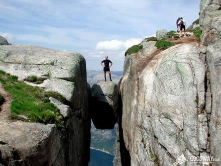 На закуску мы оставили четвёртую достопримечательность — застрявший между скалами камень-горошину. Многие мечтают зайти на него и сфотографироваться над пропастью. Чтобы сделать это, придётся потратить весь день, с 7 утра до 7 вечера. Сначала ехать на автобусе, потом идти 7км с подъёмом на 500м в одну сторону и также обратно. Экскурсия не включена в стоимость похода и стоит 70 евро. Туда можно ехать по желанию. Кто не едет — можно спокойно походить тихими улочками Ставангера, накупить сувениров себе и всем знакомым.