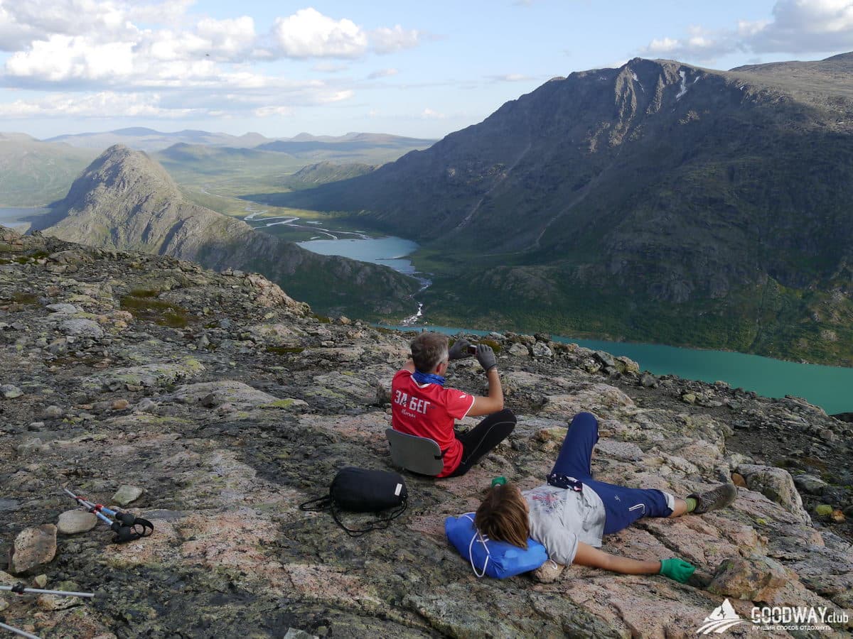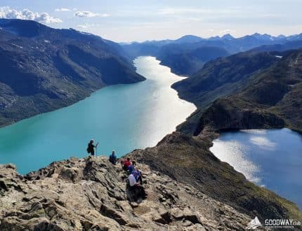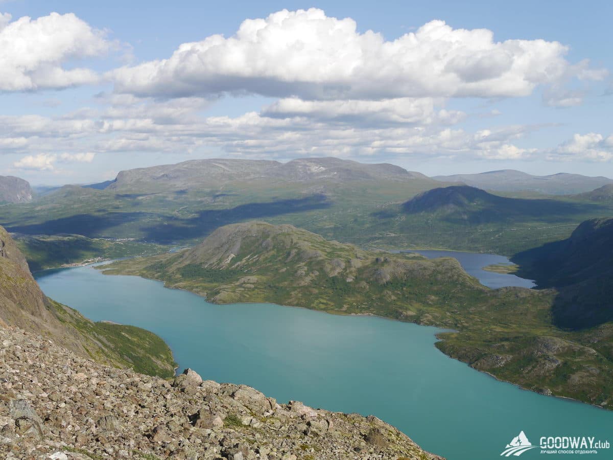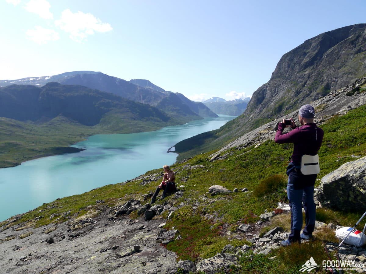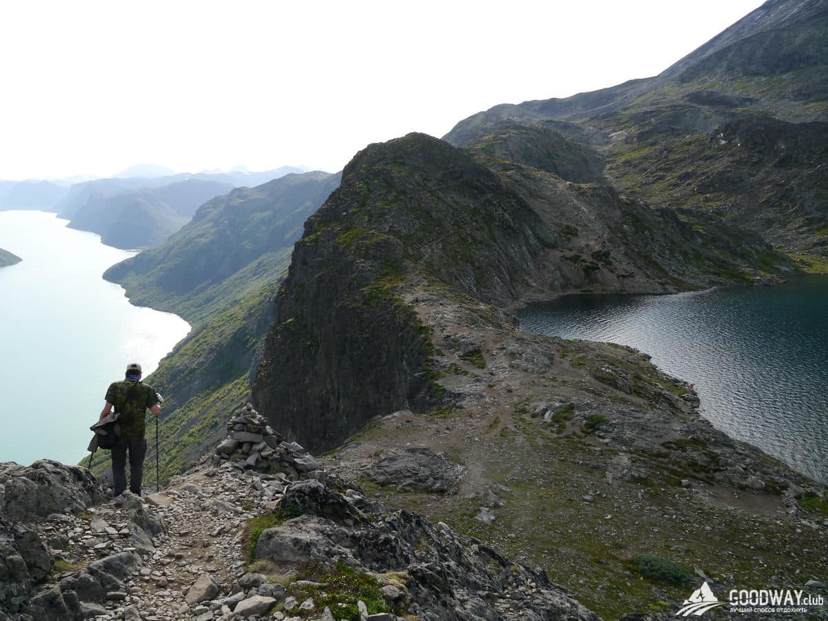 Отдаём рюкзаки на катер, а сами налегке отправляемся в трек по хребту Бессеген. Не сложная тропа выведет на гору Veslfjellet 1743 м высотой. Отсюда будут захватывающие виды сразу на 4 озера, находящиеся на разных уровнях. По мере спуска с горы будут открываться всё новые и новые виды на горы и озёра. Трек Бессеген наверное, второй по популярности в Норвегии после Языка Тролля. Картинку отсюда с видом на перемычку, разделяющую озёра Гъенде и Бессеген, ставят как заглавную на многих сайтах и обложках норвежских путеводителей.