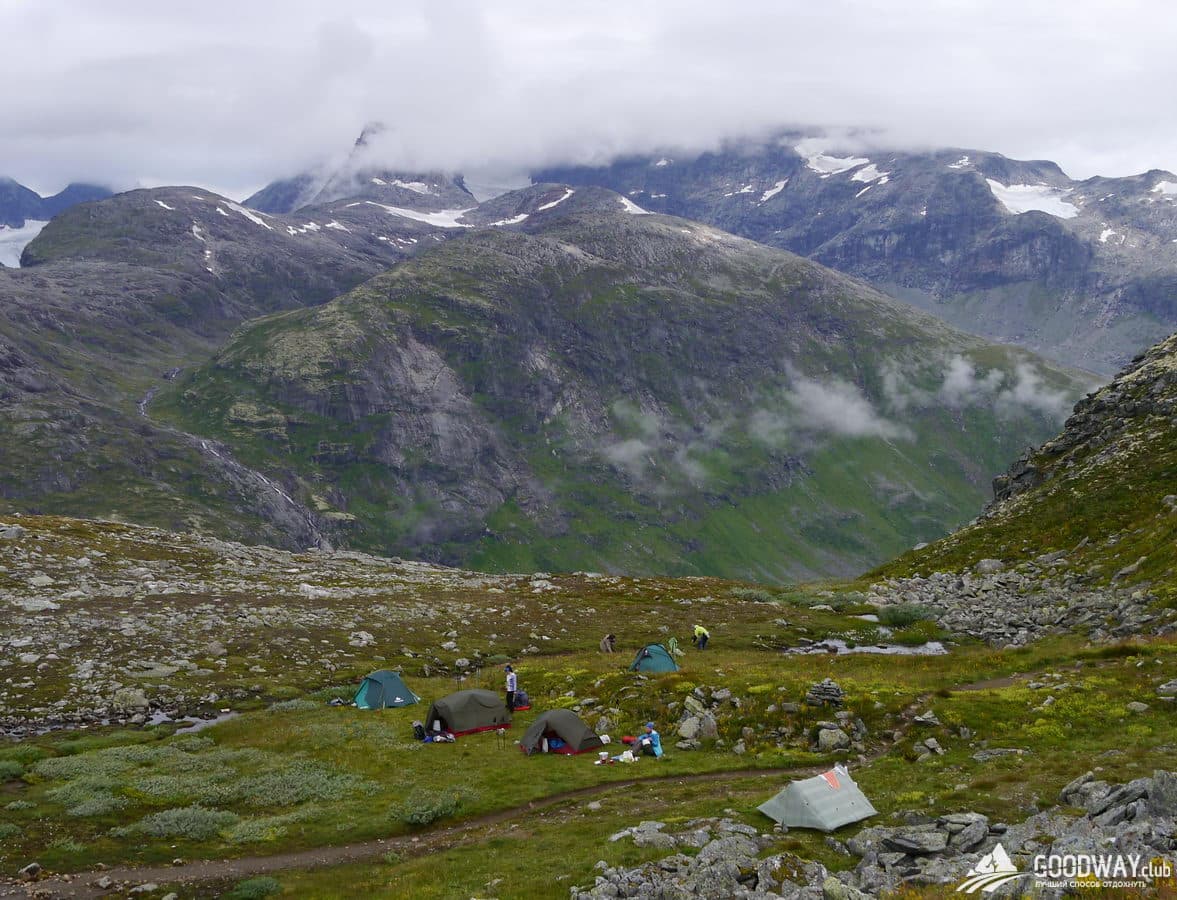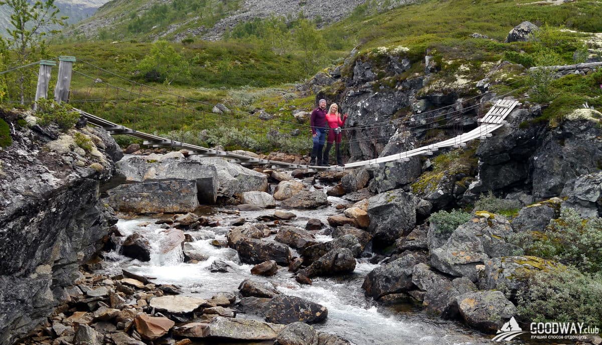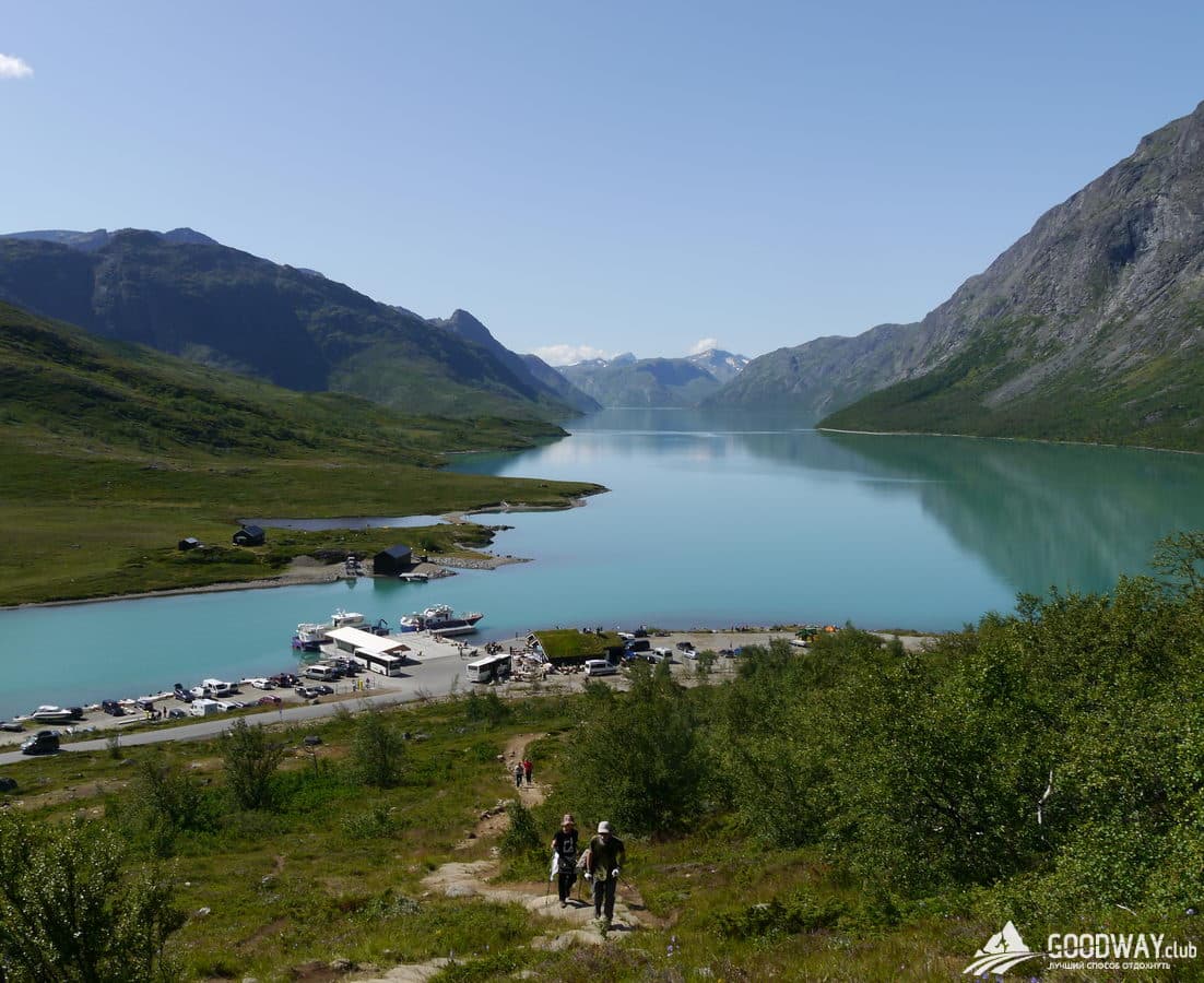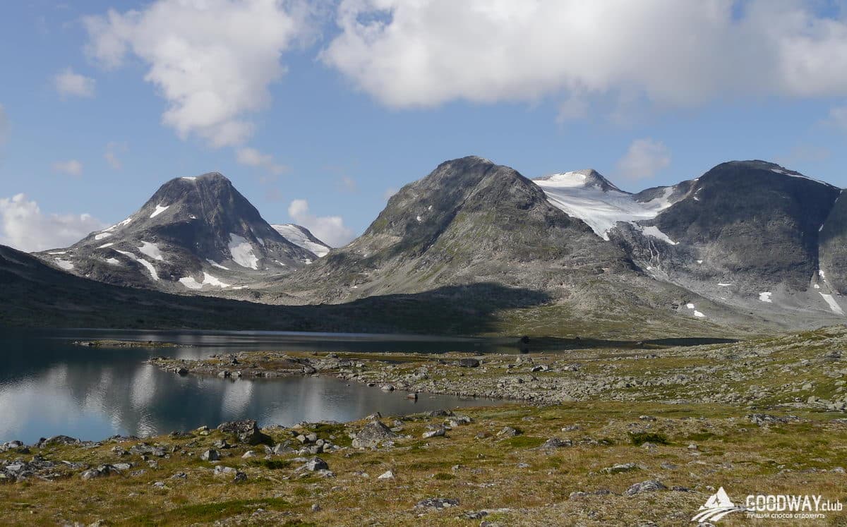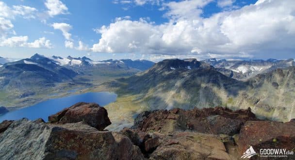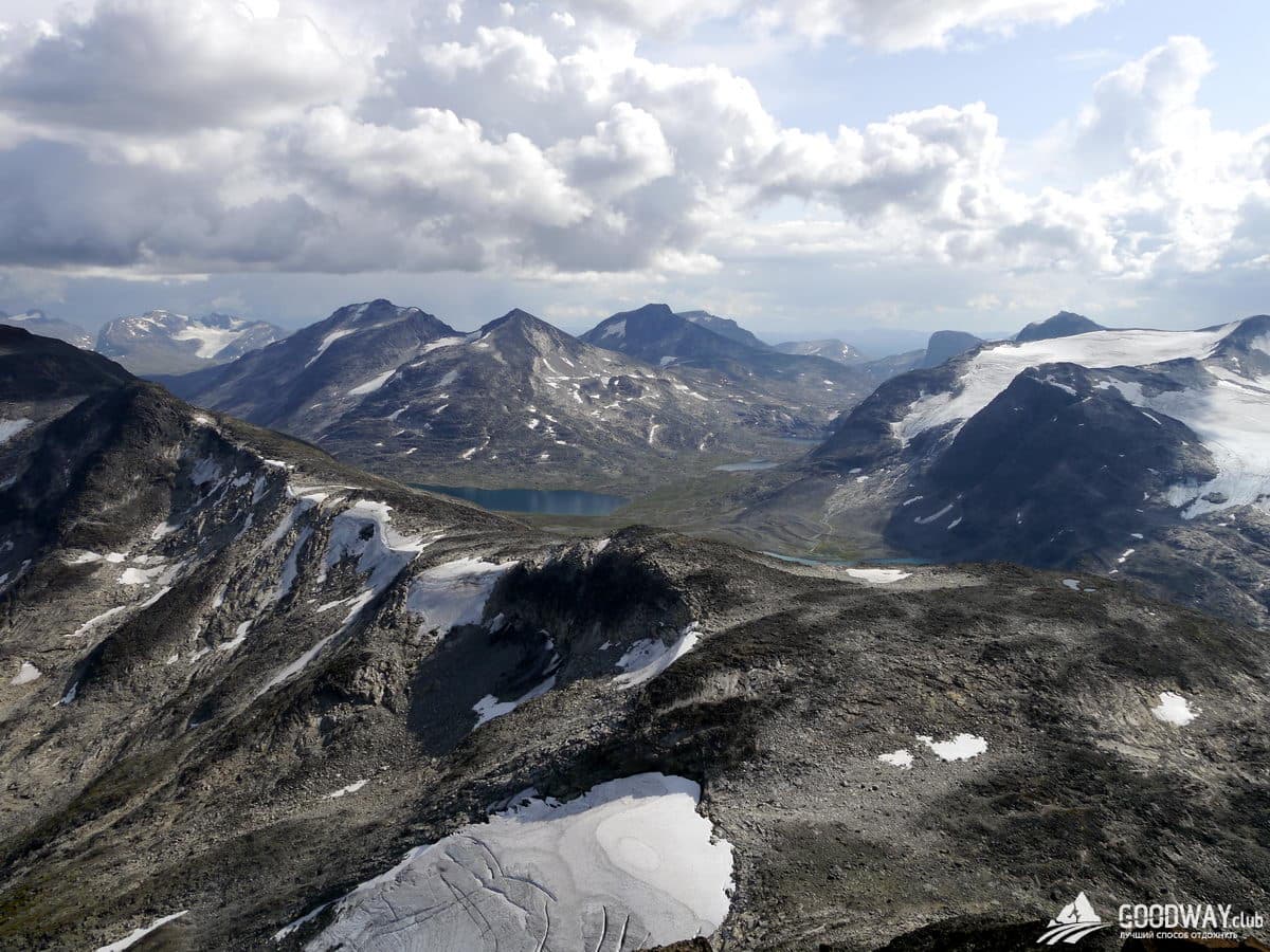 Сначала самая высокогорная местность – парк Йотунхеймен. Красоту северных гор здесь дополняет огромное количество озёр, рек и водопадов! Тропы тут каменистые и сложные, и мы максимально облегчим наш путь, не будем лезть на самую высокую гору Норвегии –Гальхёпигген (2469м), а только пройдём рядом. Но любители восхождений и панорамных видов всё равно останутся довольны: в планах забраться на гору Киркья (2032м). Вид с неё не хуже, чем с Гальхёпигген.