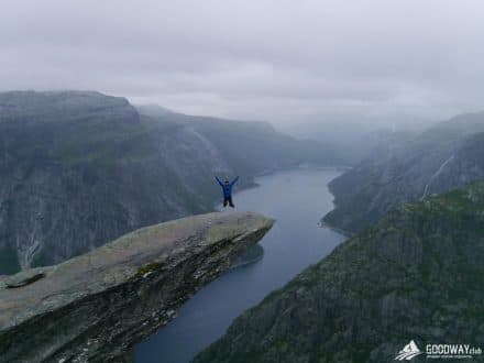 Рано утром отправляемся на язык Тролля, делаем памятные фото. Времени у нас вдоволь, никуда не торопимся. Кстати, по пути будет пара мест, по виду даже превосходящие Язык. Разве что там нет пропасти под вами.
