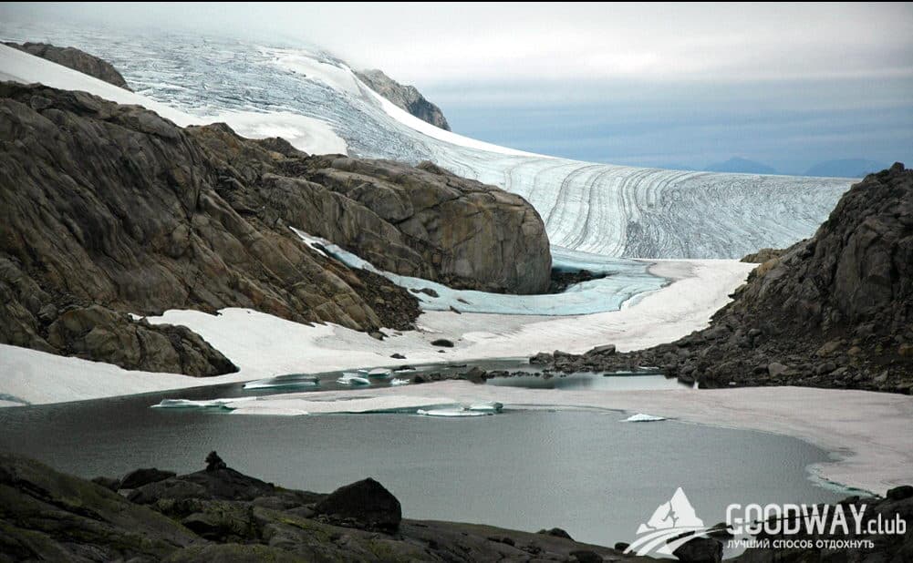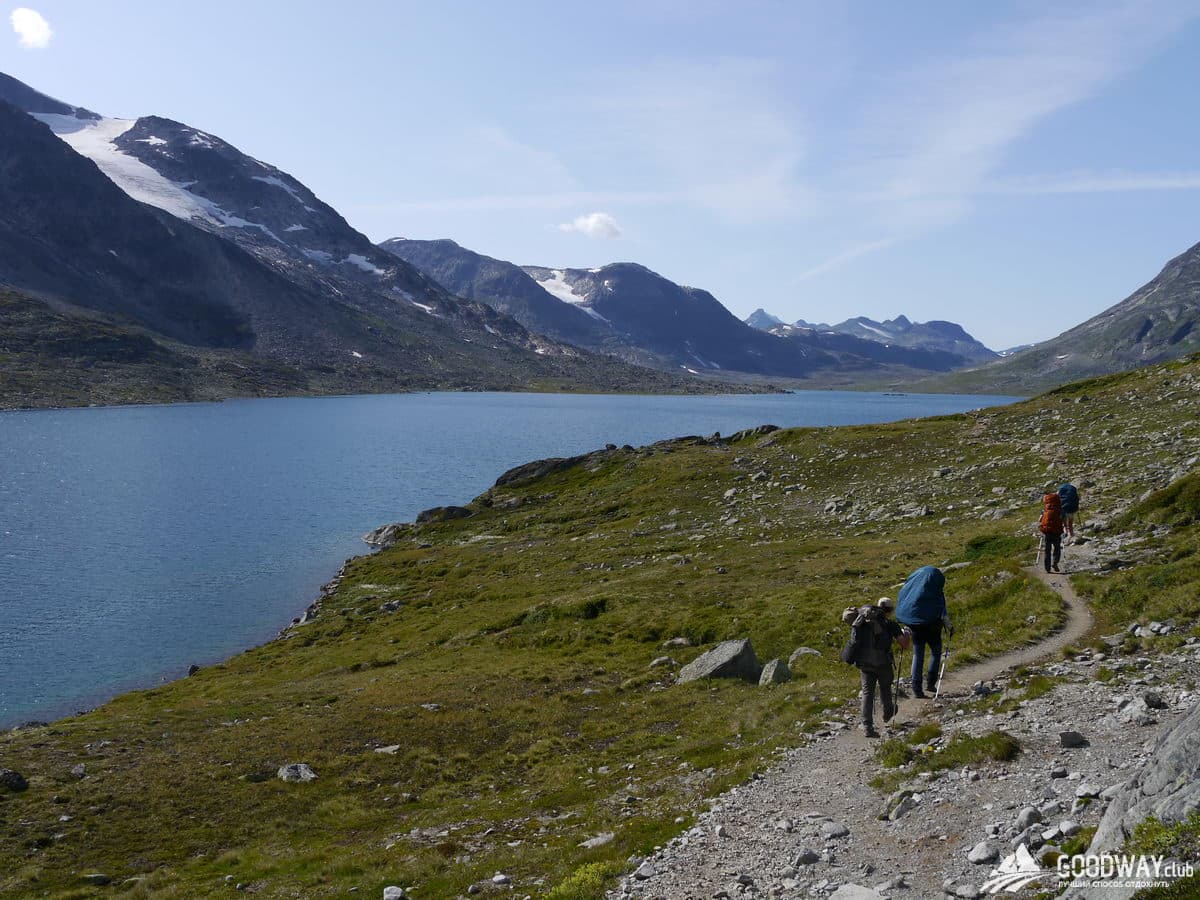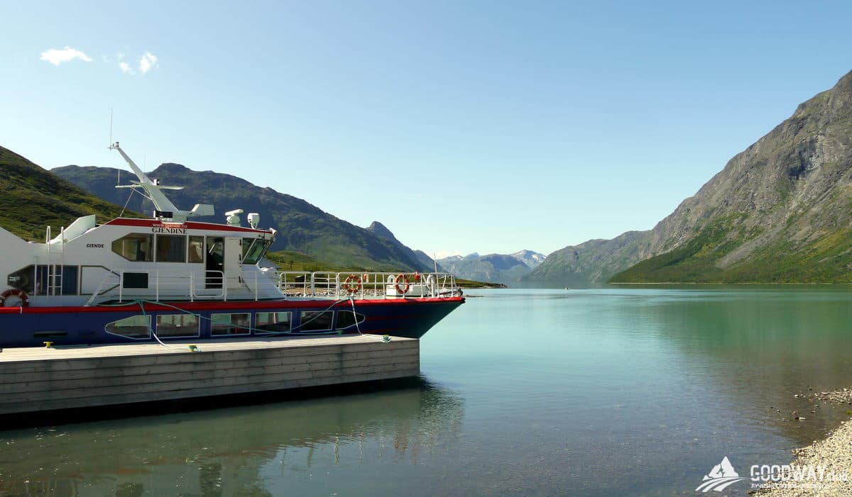 На быстроходном катере переедем на западный край озера Гъенде, в посёлок Гъендебу (произносится Яндебу). Первый переход под рюкзаками будет короткий, но живописный. Вдоль горной реки, образующей несколько водопадов, поднимаемся к живописному озеру Лангватнет. Нас уже окружают снежные вершины, мы внутри красоты Йотунхеймена!